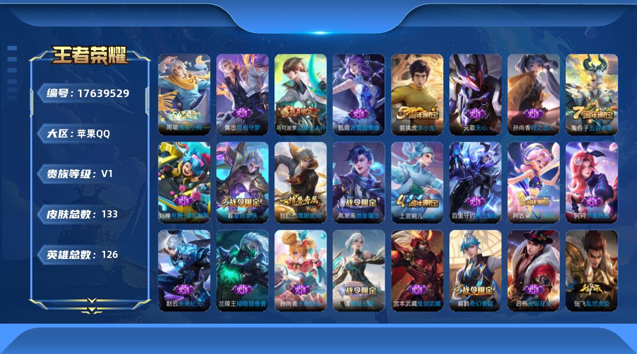 [17639529]苹果Q-133皮肤-29史诗 【限定皮肤】:姜子牙天穹之誓,狄仁杰阴阳师,赵云皇家上将,高渐离玩趣恶龙,扁鹊奇幻香踪,元歌无心,马可波罗山海玄木吟,项羽海滩派对,老夫子醍醐杖,李元芳云中旅人,杨戬潮玩骑兵,鬼谷子原初探秘者,鬼谷子五谷丰年,明世隐疑决卦,裴擒虎李小龙,裴擒虎擒涛扼浪,盾山御銮,上官婉儿梁祝,嫦娥暖冬兔眠,鲁班大师探海日志,桑启海盐诗旅,暃星界游侠,阿古朵江河有灵,张良古海寻踪,蒙犽百解令,高渐离燃音魔法,妲己灵卜魔法,鬼谷子天穹祈灯,沈梦溪龙舞盛年,刘邦剑破天穹,程咬金群星魔术团,镜青焰无极,项羽苍威无极,周瑜熔金海岸 【年限皮肤】:马可波罗山海玄木吟 【赛季限定】:盾山御銮,明世隐疑决卦,老夫子醍醐杖,鬼谷子原初探秘者,李元芳云中旅人,桑启海盐诗旅,裴擒虎擒涛扼浪,鲁班大师探海日志,张良古海寻踪,鬼谷子天穹祈灯,刘邦剑破天穹,姜子牙天穹之誓 【战令限定】:暃星界游侠,嫦娥暖冬兔眠,扁鹊奇幻香踪,杨戬潮玩骑兵,高渐离燃音魔法,妲己灵卜魔法,镜青焰无极,项羽苍威无极,周瑜线条小狗 【史诗皮肤】:周瑜线条小狗,黄忠百相守梦,镜青焰无极,高渐离燃音魔法,妲己灵卜魔法,蒙犽百解令,阿古朵江河有灵,刘禅电玩爆裂旋风,扁鹊奇幻香踪,马可波罗山海玄木吟,暃星界游侠,元歌无心,鬼谷子五谷丰年,裴擒虎李小龙,孙尚香时之恋人,上官婉儿梁祝,狄仁杰鹰眼统帅,阿轲节奏热浪,程咬金功夫厨神,百里守约特工魅影,兰陵王暗隐猎兽者,张飞乱世虎臣,吕布圣诞狂欢,妲己魅力维加斯,嬴政摇滚巨星,孙尚香水果甜心,宫本武藏鬼剑武藏,王昭君偶像歌手,甄姬冰雪圆舞曲,赵云未来纪元,赵云皇家上将 【其他皮肤】:兰陵王雾影缉谜,莱西奥踏浪烽翎,白起死霸装,姬小满小满鸭,露娜命运加冕,姜子牙星梦巡礼,周瑜熔金海岸,姜子牙天穹之誓,项羽苍威无极,程咬金群星魔术团,刘邦剑破天穹,钟无艳春野之旅,沈梦溪龙舞盛年,廉颇功夫炙烤,海诺时空谍影,妲己灵卜魔法,鬼谷子天穹祈灯,后羿完美运算,张良古海寻踪,李元芳妄想特派,姬小满零食大作战,鲁班大师探海日志,太乙真人劲辣红锅,杨戬潮玩骑兵,裴擒虎擒涛扼浪,猪八戒潮玩探月行,嫦娥暖冬兔眠,桑启海盐诗旅,刘备潮玩造梦师,李元芳云中旅人,蒙恬蔚蓝守将,程咬金无双福将,鲁班大师乓乓大师,露娜瓷语鉴心,鬼谷子原初探秘者,狂铁特工战影,老夫子醍醐杖,明世隐疑决卦,沈梦溪鲨炮海盗
