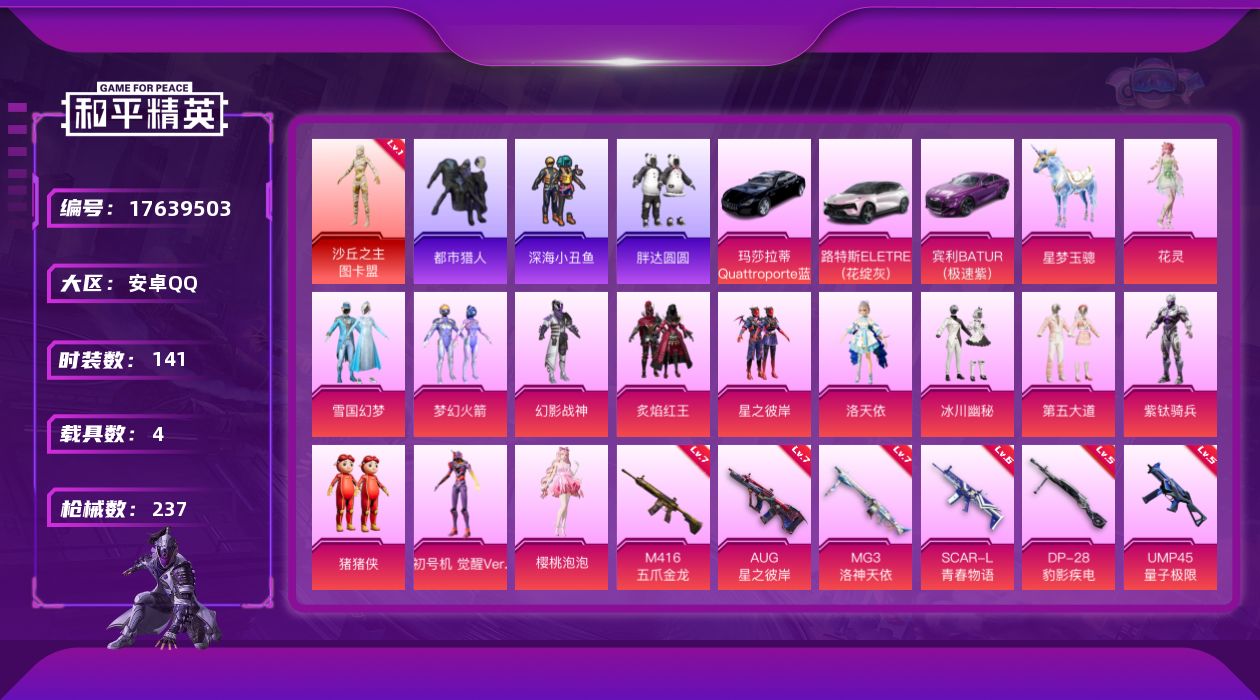 [17639503]安卓 手Q-1神装-13粉装-12特效枪-4载具-8粉色飞行器-80886热力值-11王牌印记-141套装-237枪皮
