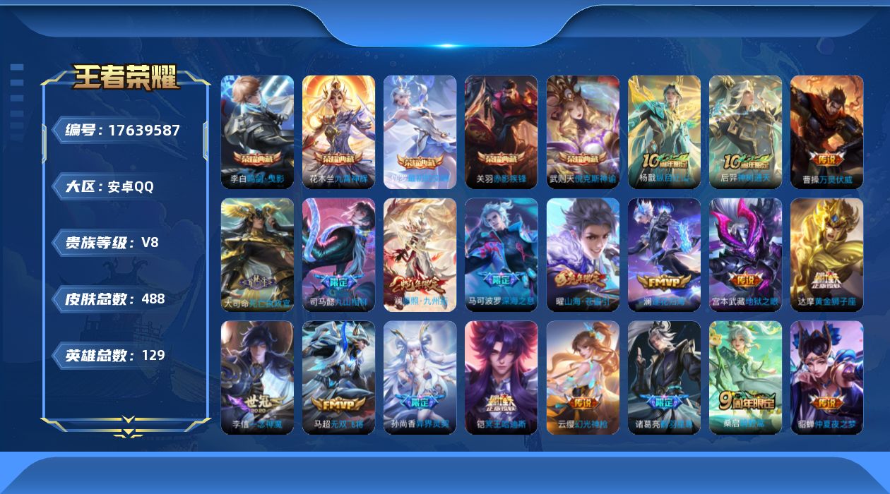 [17639587]安卓Q-V8-最强王者段位-129英雄-488皮肤-5典藏皮肤-1典藏英雄-30传说-156史诗
