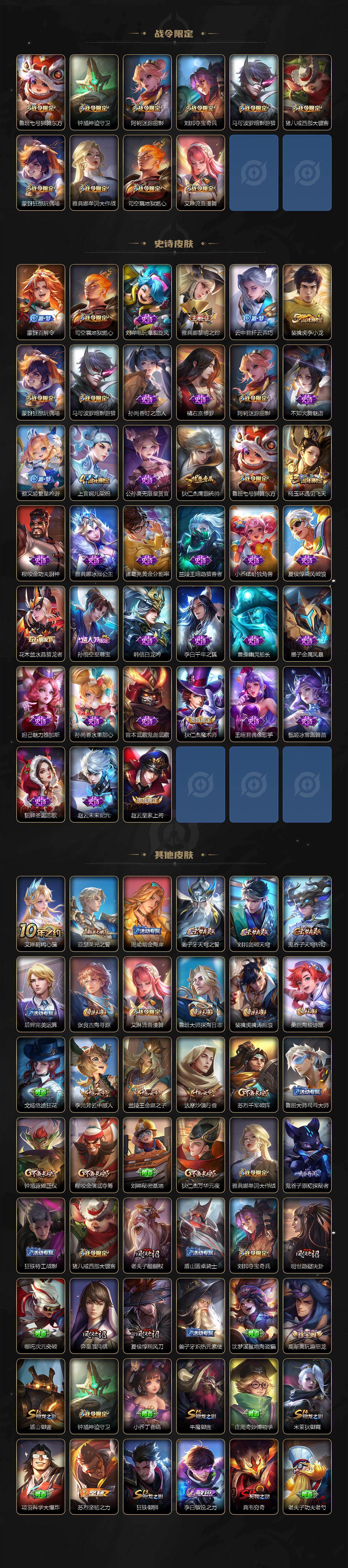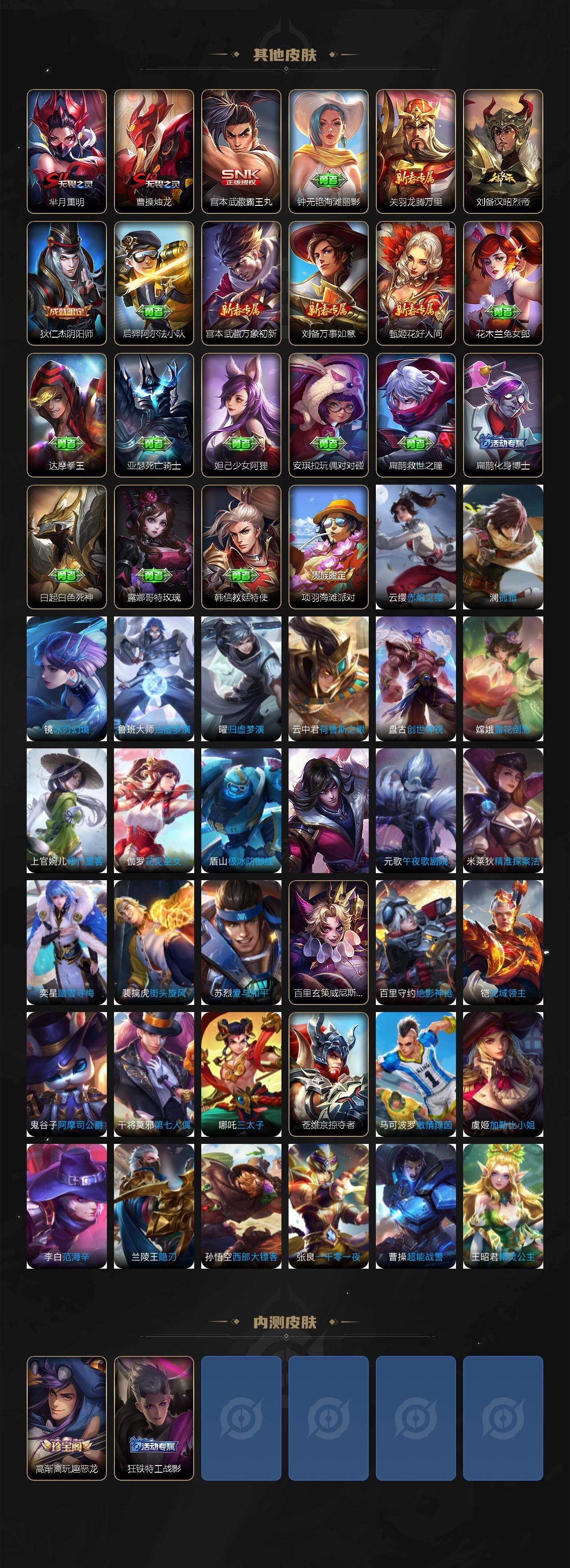 【赛季限定】:曹操烛龙,芈月重明,典韦穷奇,狂铁御狮,米莱狄御霄,牛魔御旌,盾山御銮,夏侯惇朔风刀,弈星混沌棋,明世隐疑决卦,老夫子醍醐杖,鬼谷子原初探秘者,狄仁杰万华元夜,程咬金演武夺筹,钟馗驱傩正仪,苏烈千军破阵,达摩沙漠行僧,兰陵王金庭之子,李元芳云中旅人,桑启海盐诗旅,裴擒虎擒涛扼浪,鲁班大师探海日志,张良古海寻踪,鬼谷子天穹祈灯,刘邦剑破天穹,姜子牙天穹之誓,亚瑟荣光之誓,雅典娜黎明之约