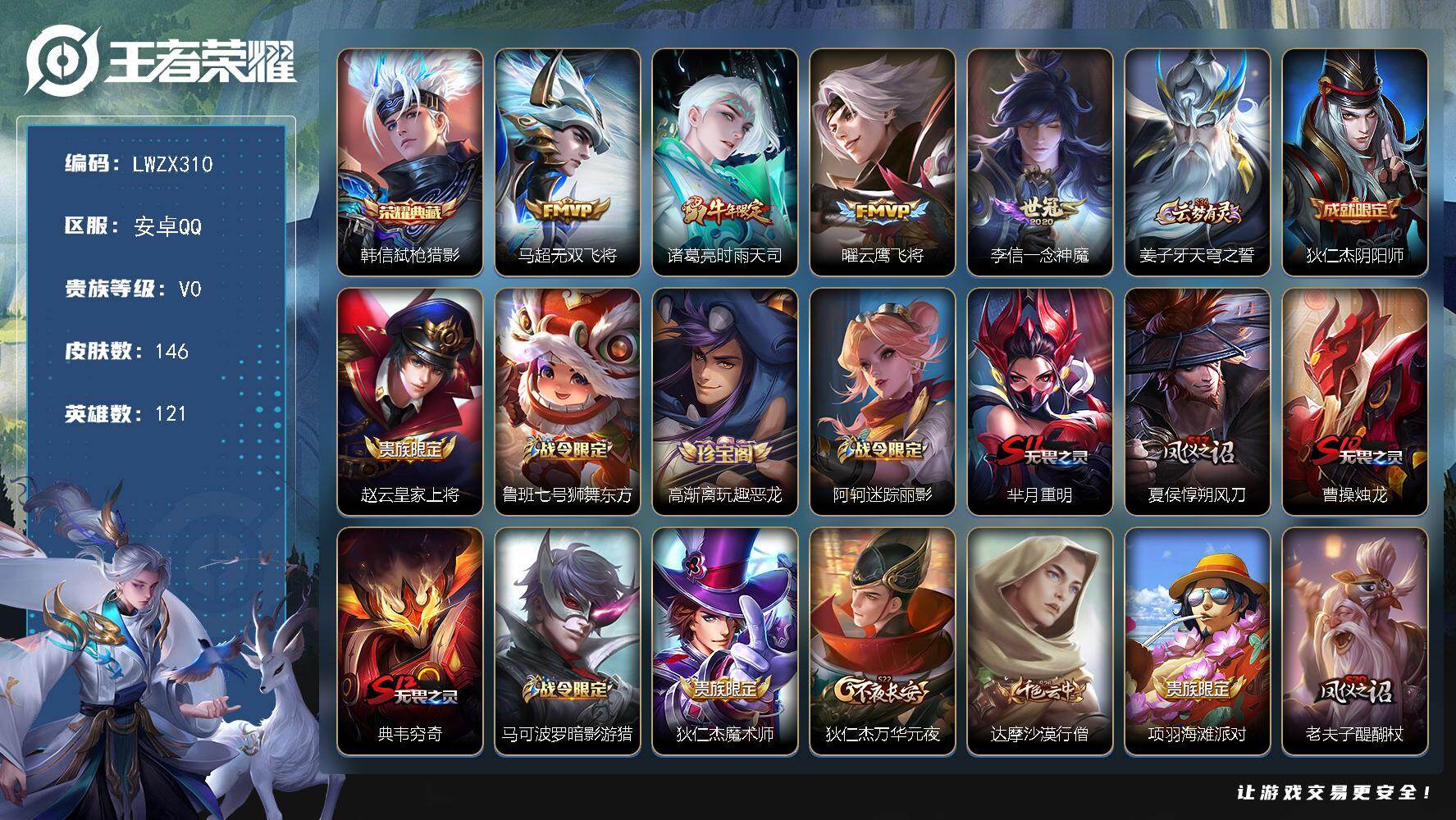 [17639541]安卓Q-V0-至尊星耀I段位-121英雄-146皮肤-1典藏皮肤-4传说-39史诗 【荣耀典藏】:韩信弑枪猎影 【传说皮肤】:马超无双飞将,诸葛亮时雨天司,曜云鹰飞将,李信一念神魔 【限定皮肤】:姜子牙天穹之誓,狄仁杰阴阳师,赵云皇家上将,鲁班七号狮舞东方,高渐离玩趣恶龙,阿轲迷踪丽影,芈月重明,夏侯惇朔风刀,曹操烛龙,典韦穷奇,马可波罗暗影游猎,狄仁杰魔术师,狄仁杰万华元夜,达摩沙漠行僧,项羽海滩派对,老夫子醍醐杖,程咬金演武夺筹,刘邦夺宝奇兵,兰陵王金庭之子,孙悟空至尊宝,牛魔御旌,李元芳云中旅人,钟馗神迹守卫,钟馗驱傩正仪,杨玉环遇见飞天,雅典娜单词大作战,雅典娜黎明之约,蔡文姬繁星吟游,鬼谷子原初探秘者,诸葛亮时雨天司,苏烈千军破阵,弈星混沌棋,明世隐疑决卦,裴擒虎李小龙,裴擒虎擒涛扼浪,狂铁御狮,米莱狄御霄,云中君纤云弄巧,盾山御銮,猪八戒西部大镖客,上官婉儿梁祝,蒙犽狂想玩偶喵,鲁班大师探海日志,桑启海盐诗旅,艾琳流音漫舞,司空震地狱燃心,张良古海寻踪,蒙犽百解令,鬼谷子天穹祈灯,刘邦剑破天穹,周瑜熔金海岸 【年限皮肤】:诸葛亮时雨天司 【赛季限定】:曹操烛龙,芈月重明,典韦穷奇,狂铁御狮,米莱狄御霄,牛魔御旌,盾山御銮,夏侯惇朔风刀,弈星混沌棋,明世隐疑决卦,老夫子醍醐杖,鬼谷子原初探秘者,狄仁杰万华元夜,程咬金演武夺筹,钟馗驱傩正仪,苏烈千军破阵,达摩沙漠行僧,兰陵王金庭之子,李元芳云中旅人,桑启海盐诗旅,裴擒虎擒涛扼浪,鲁班大师探海日志,张良古海寻踪,鬼谷子天穹祈灯,刘邦剑破天穹,姜子牙天穹之誓,亚瑟荣光之誓,雅典娜黎明之约 【战令限定】:鲁班七号狮舞东方,钟馗神迹守卫,阿轲迷踪丽影,刘邦夺宝奇兵,马可波罗暗影游猎,猪八戒西部大镖客,蒙犽狂想玩偶喵,雅典娜单词大作战,司空震地狱燃心,艾琳流音漫舞 【史诗皮肤】:蒙犽百解令,司空震地狱燃心,刘禅电玩爆裂旋风,雅典娜黎明之约,云中君纤云弄巧,裴擒虎李小龙,蒙犽狂想玩偶喵,马可波罗暗影游猎,孙尚香时之恋人,橘右京修罗,阿轲迷踪丽影,不知火舞魅语,蔡文姬繁星吟游,上官婉儿梁祝,公孙离无限星赏官,狄仁杰鹰眼统帅,鲁班七号狮舞东方,杨玉环遇见飞天,程咬金功夫厨神,雅典娜冰冠公主,诸葛亮黄金分割率,兰陵王暗隐猎兽者,小乔缤纷独角兽,夏侯惇乘风破浪,花木兰水晶猎龙者,孙悟空至尊宝,韩信白龙吟,李白千年之狐,曹操幽