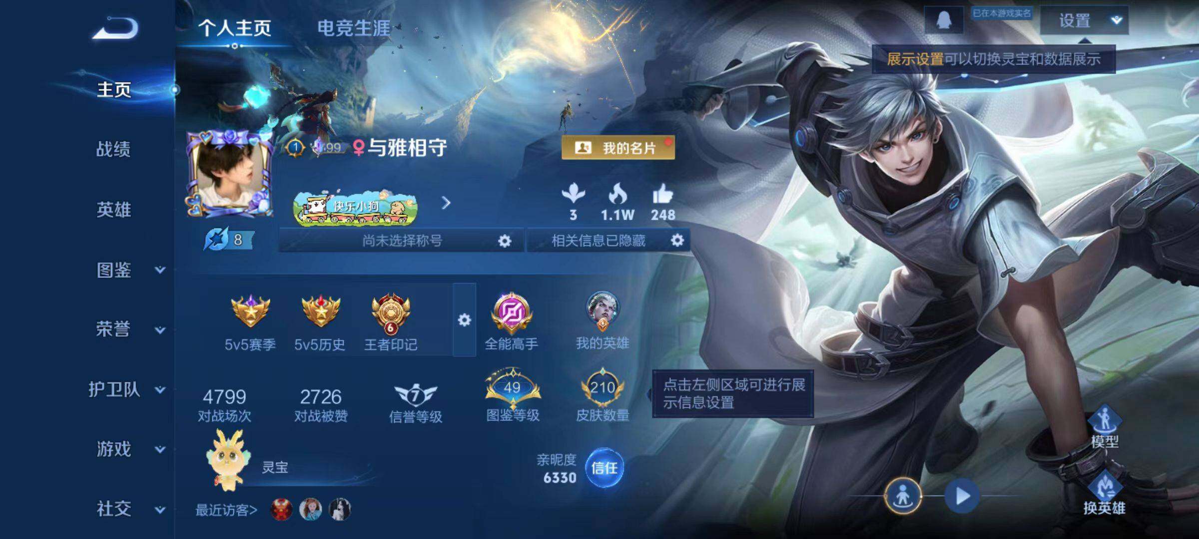 - PX_2096299-实名: 可修改 贵族等级: V4 英雄数: 97 皮肤数: 82 珍品传说: 大耳狗之梦 星传说: 未来机甲 传说皮: 末日机甲-孙尚香,音你心动-小乔 限定皮: 至美·乘鲤谣,鸣野蒿