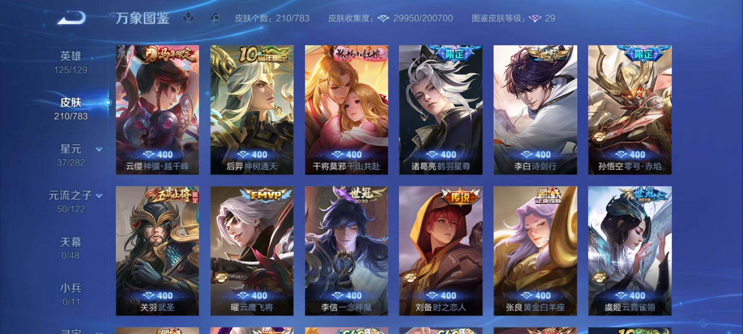 【限定皮肤】:狄仁杰阴阳师,赵云皇家上将,赵云引擎之心,孙尚香蔷薇恋人,庄周高山流水,扁鹊奇幻香踪,狄仁杰魔术师,狄仁杰万华元夜,达摩沙漠行僧,项羽海滩派对,关羽武圣,程咬金演武夺筹,孙悟空大圣娶亲,孙悟空零号赤焰,李元芳云中旅人,钟馗驱傩正仪,杨戬潮玩骑兵,干将莫邪胡桃夹子,雅典娜单词大作战,鬼谷子原初探秘者,鬼谷子五谷丰年,诸葛亮鹤羽星尊,铠青龙志,苏烈千军破阵,百里守约朱雀志,沈梦溪大漠名商,裴擒虎李小龙,裴擒虎擒涛扼浪,米莱狄胡桃异想国,嫦娥拒霜思,西施玲珑珍味,蒙犽狂想玩偶喵,鲁班大师探海日志,桑启海盐诗旅,戈娅驭风魔法,艾琳流音漫舞,司空震地狱燃心,阿古朵江河有灵,张良古海寻踪,蒙犽百解令,蒙恬荣光圣徽,鬼谷子天穹祈灯,伽罗琥珀纪元,沈梦溪龙舞盛年,刘邦剑破天穹,镜青焰无极