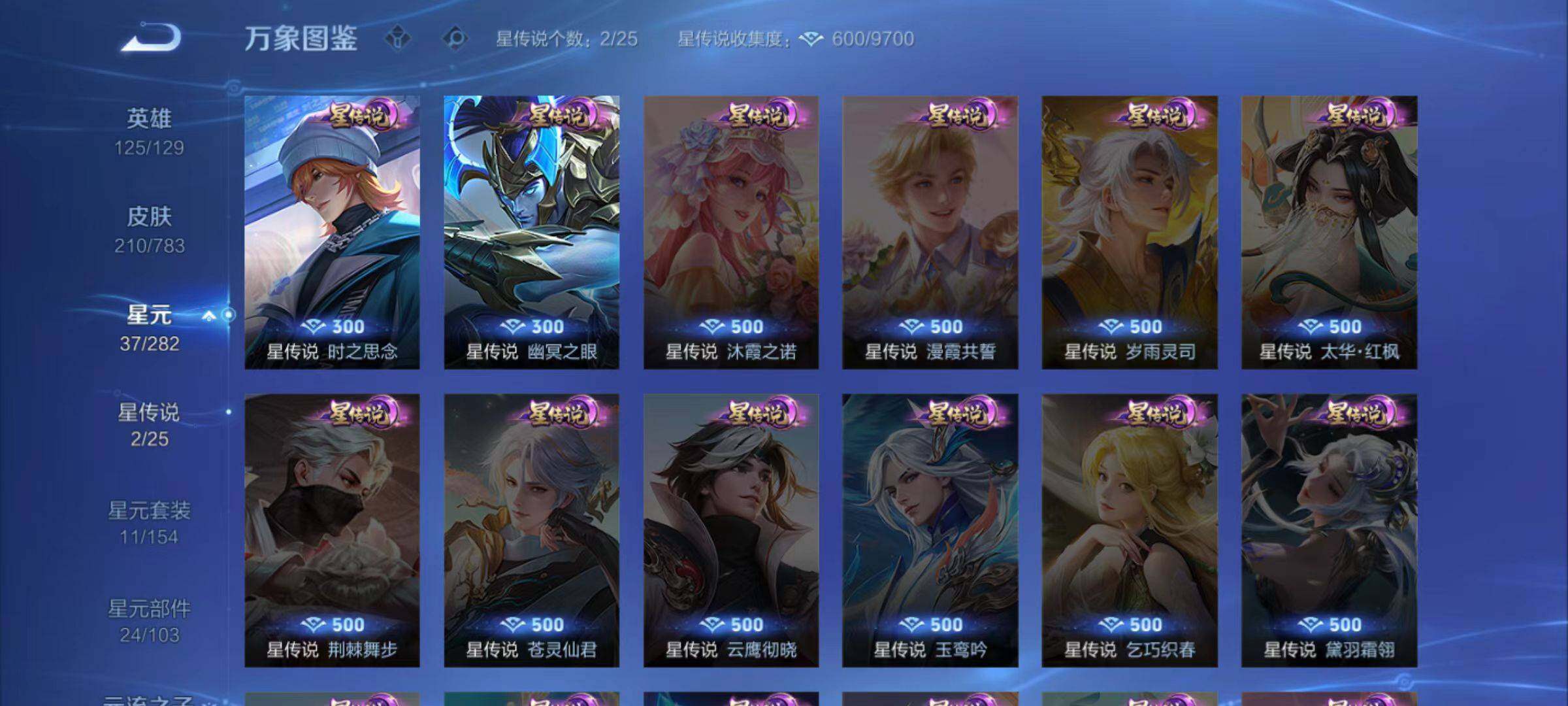 【史诗皮肤】:周瑜线条小狗,小乔线条小狗,项羽九幽镇关,少司缘巫礼祀神,女娲万灵启世,莱西奥光弋星穹,公孙离涂山容容,西施织梦人,朵莉亚幻珠鲛人,黄忠百相守梦,周瑜百相守梦,扁鹊灵蛊蚀心,镜青焰无极,伽罗琥珀纪元,蒙恬荣光圣徽,蒙犽百解令,阿古朵江河有灵,司空震地狱燃心,百里守约真我赫兹,戈娅驭风魔法,扁鹊奇幻香踪,鬼谷子五谷丰年,嫦娥拒霜思,司马懿暗渊魔法,庄周高山流水,米莱
