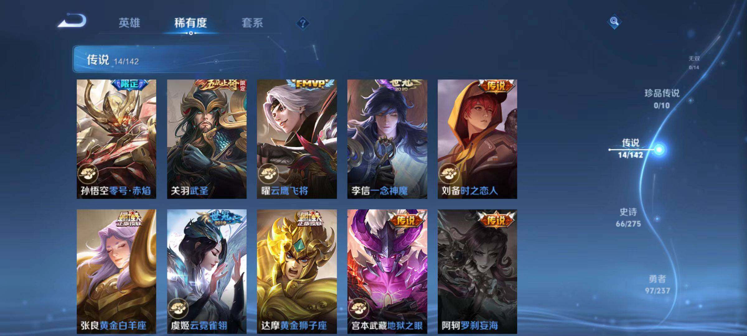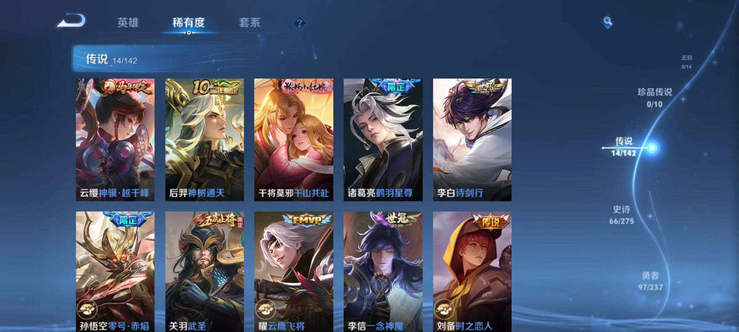 【传说皮肤】:云缨神骥越千峰,后羿神树通天,干将莫邪千山共赴,诸葛亮鹤羽星尊,李白诗剑行,孙悟空零号赤焰,关羽武圣,曜云鹰飞将,李信一念神魔,刘备时之恋人,张良黄金白羊座,虞姬云霓雀翎,达摩黄金狮子座,宫本武藏地狱之眼