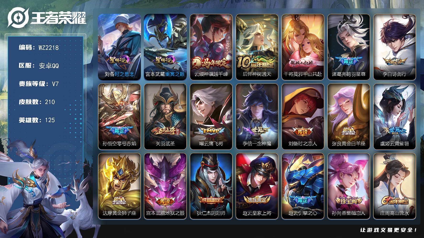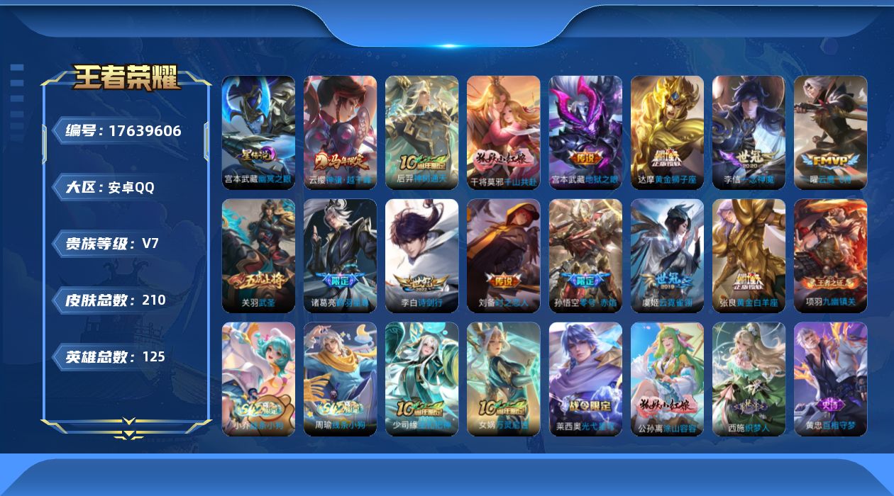 - [11846282]V8 1典藏 1珍品传说 24传说 125英雄 233皮肤 可修改实名 女号 优质装备:九霄神辉(木兰典藏),怪盗基德,黄金狮子座,炽阳神光,一念神魔,末日机甲-孙尚香(绿蚂蚱),地狱火,仲夏夜之梦(大飞蛾),地狱之眼,音你心动-周瑜,乞巧织情,淬星耀世,超时空战士-狄仁杰,浮生妄,遇见神鼓,鲁班七号-时之奇旅,澜逐花归海,黄金天蝎座 传说皮:乘龙·问璇玑(孙尚香年限),吕布曦玄引,落雪白狼 珍宝阁皮:妄想食味 限定皮:逐霄战戟,鸣野蒿,夏侯惇霜北刀,遇见飞天,怒海麟威,御风骁将(吕布年限),逐梦之翼,烈魂,默契交锋-花木兰,天魔缭乱,女儿国国王,寅虎·御盾(廉颇年限),玉兔公主,山海·玄木吟(马可年限) 史诗皮:鸭鸭历险记-刘禅,苍鳞隐世,器灵·浮梦炉,糖绘人间,星界战将,龙之律动,石田雨龙,怒海争锋,炽弈燎原,撼地雄心,破空之剑,战舞者,蒙犽顽岩魄,芈月浮光幕影,琥珀纪元伽罗,蔬乡物语(鲁班七号),百相守梦-百里守约,百相守梦-黄忠,电玩小子(小书包),特工魅影,永昼,江河有灵,匿光侦查者,雪夜绮愿(周瑜),浮梦罗烟,魅语,百解令(蒙犽),高渐离燃音魔法,蒙恬荣光圣徽,冰冠公主,青蛇,偶像歌手,末日机甲-吕布,猫狗日记-孙策,节奏热浪,修罗,女仆咖啡,摇滚巨星,水果甜心,星夜王子,心灵骇客,功夫厨神,德古拉伯爵,暗隐猎兽者,鬼剑武藏,心灵战警,乐园奇幻夜,天秀·启明,地狱岩魂,纤云弄巧,拒霜思,逐浪之夏,水晶猎龙者,曙光守护者,金属风暴,圣诞狂欢,鹰眼统帅,雪上飞焰,寅虎·御盾