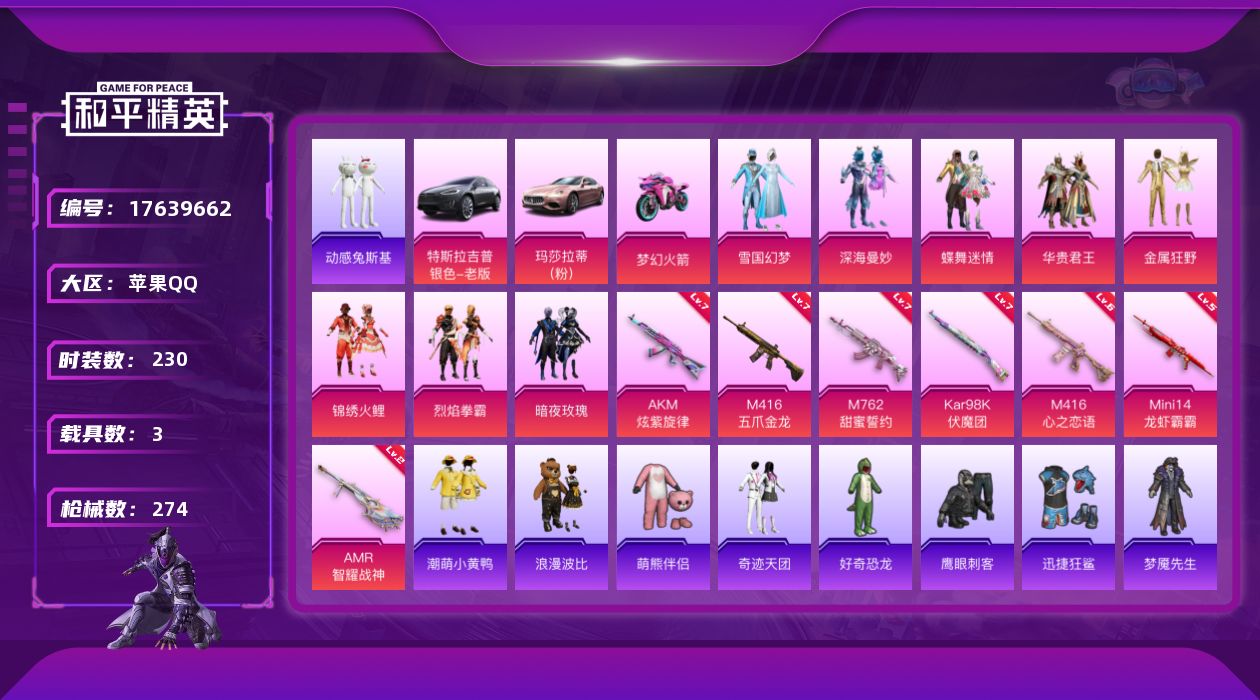 [17639662]可二次【特价出售/店主推荐】无敌战神框1 苹果 手Q-无敌战神框-8粉装-7特效枪-3载具-2粉色飞行器-101941热力值-20王牌印记-230套装-274枪皮【热门品类】:粉装-雪国幻梦,套装-浪漫天命,套装-金羽特工,套装-忍者信条,套装-动感兔斯基人偶服,套装-SS1特训,套装-潮萌小黄鸭,套装-浪漫波比,套装-萌熊伴侣,熔岩游骑兵连帽夹克【粉色套装】:粉装-深海曼妙,粉装-雪国幻梦,粉装-蝶舞迷情,粉装-华贵君王,粉装-金属狂野,粉装-锦绣火鲤,粉装-烈焰拳霸,粉装-暗夜玫瑰【粉色枪皮等级】:AKM-炫紫旋律(七级),M416-五爪金龙(七级),M416-心之恋语(六级),M762-甜蜜誓约(七级),Kar98K-伏魔团(七级),Mini14-龙虾霸霸(五级),AMR-智耀战神(二级)【粉色载具】:特斯拉Model X(冷光银),玛莎拉蒂Ghibli(粉),双人摩托-梦幻火箭【粉色枪皮】:AKM-炫紫旋律,M416-五爪金龙,M416-心之恋语,M762-甜蜜誓约,Kar98K-伏魔团,Mini14-龙虾霸霸,AMR-智耀战神【粉色飞行器】:春暖花开飞行器,梦幻火箭飞行器