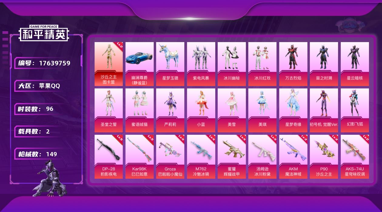 苹果 手Q-1神装-15粉装-11特效枪-2载具-6粉色飞行器-54770热力值-10王牌印记-96套装-149枪皮【红色神装等级】:沙丘之主-图卡盟(二级)