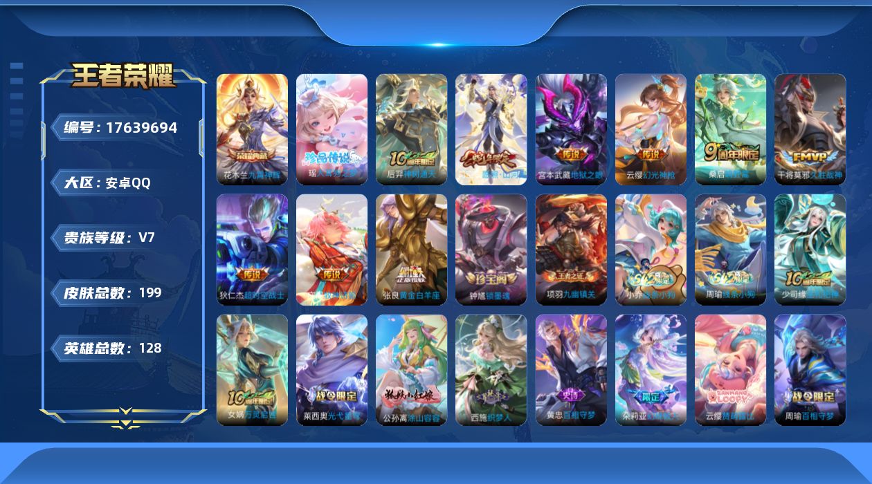 [17639694]安卓Q-V7-最强王者段位-128英雄-199皮肤-1典藏皮肤-1珍品传说-9传说-71史诗