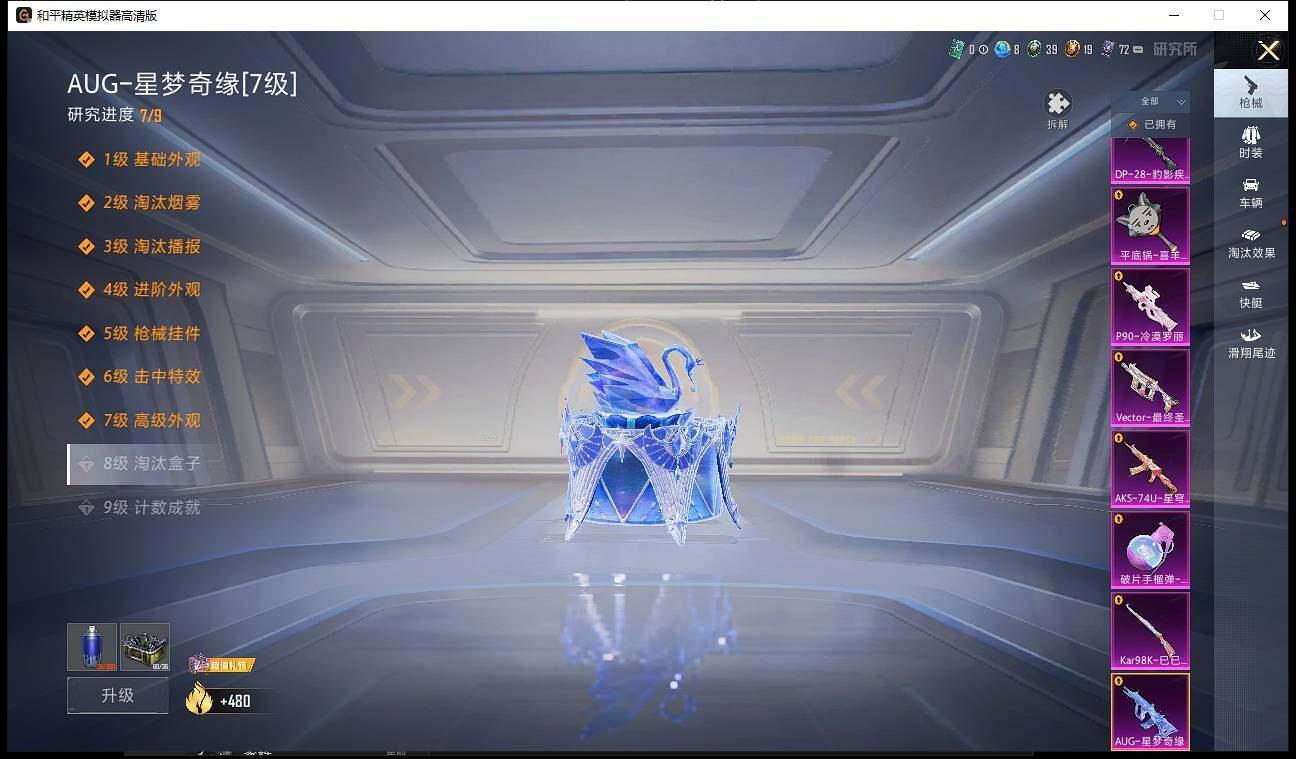 【粉色枪皮等级】:AUG-星梦奇缘(七级),Vector-最终圣卫者(三级),AKS-74U-星穹咏叹调(六级),P90-冷漠罗丽(六级),Kar98K-巳巳如意(五级),DP-28-豹影疾电(五级),平底锅-喜羊羊与灰太狼(一级),破片手榴弹-瓶中星球(六级)
