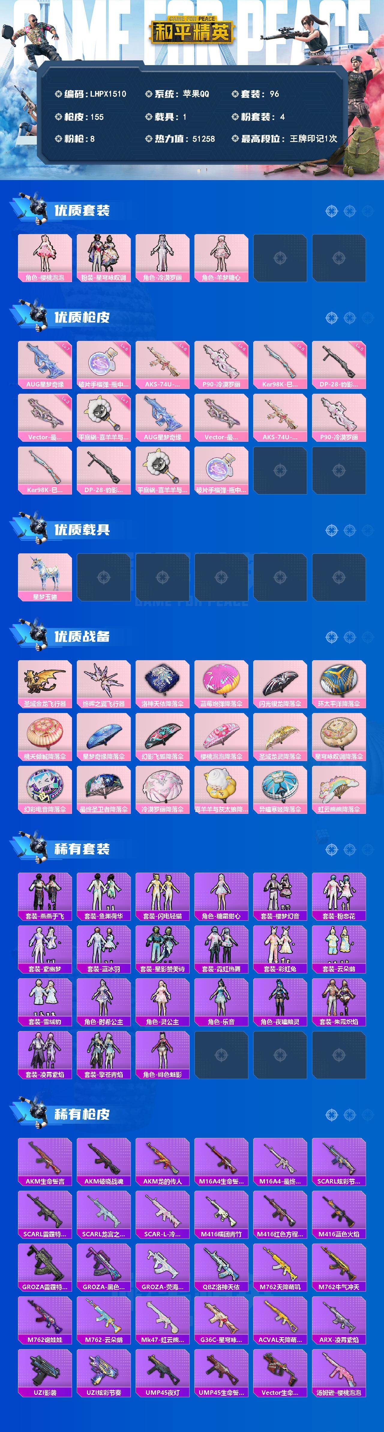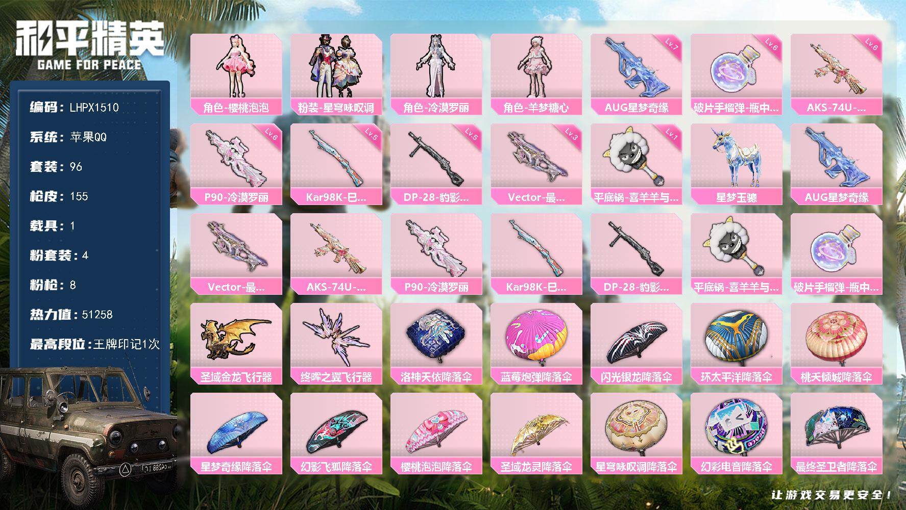 [17639792]AUG-星梦奇缘(七级) 苹果 手Q-4粉装-8特效枪-1载具-2粉色飞行器-51258热力值-1王牌印记-96套装-155枪皮
