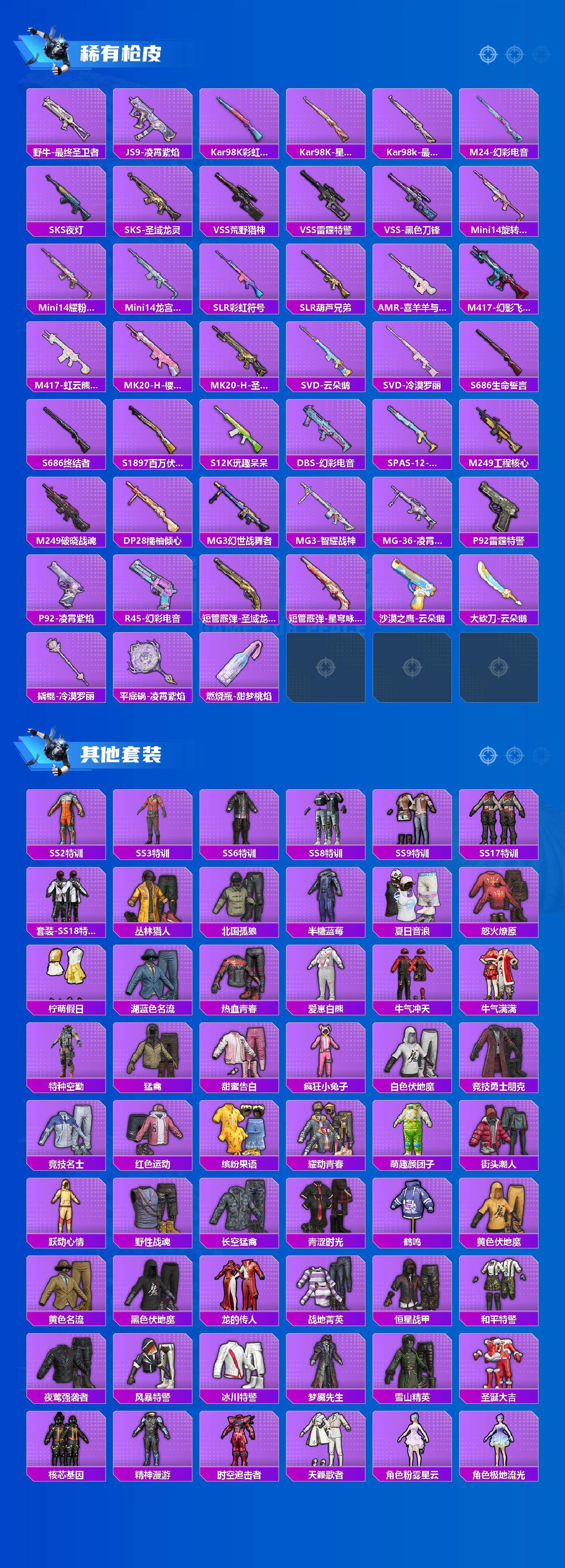 【稀有枪皮】:AKM-生命誓言,AKM-破晓战魂,AKM-龙的传人,M16A4-生命誓言,M16A4-最终圣卫者,SCAR-L-炫彩节奏,SCAR-L-雷霆特警,SCAR-L-龙宫之主,SCAR-L-冷漠罗丽,M416-糯团青竹,M416-红色方程式,M416-蓝色火焰,GROZA-雷霆特警,GROZA-黑色刀锋,GROZA-荧海星豚,QBZ-洛神天依,M762-天降萌叽,M762-牛气冲天,M762-诡娃娃,M762-云朵鹅,Mk47-虹云熊熊,G36C-星穹咏叹调,AC-VAL-天降萌叽,ARX-凌霄紫焰,UZI-影袭,UZI-炫彩节奏,UMP45-夜灯,UMP45-生命誓言,Vector-生命誓言,汤姆逊-樱桃泡泡,野牛-最终