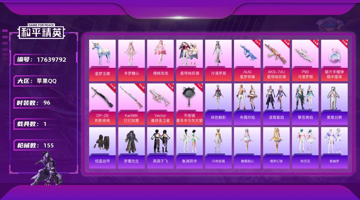 [17639792]AUG-星梦奇缘(七级) 苹果 手Q-4粉装-8特效枪-1载具-2粉色飞行器-51258热力值-1王牌印记-96套装-155枪皮 【粉色套装】:角色-樱桃泡泡,粉装-星穹咏叹调,角色-冷漠罗丽,角色-羊梦糖心 【粉色枪皮等级】:AUG-星梦奇缘(七级),Vector-最终圣卫者(三级),AKS-74U-星穹咏叹调(六级),P90-冷漠罗丽(六级),Kar98K-巳巳如意(五级),DP-28-豹影疾电(五级),平底锅-喜羊羊与灰太狼(一级),破片手榴弹-瓶中星球(六级) 【粉色载具】:星梦玉骢 【粉色枪皮】:AUG-星梦奇缘,Vector-最终圣卫者,AKS-74U-星穹咏叹调,P90-冷漠罗丽,Kar98K-巳巳如意,DP-28-豹影疾电,平底锅-喜羊羊与灰太狼,破片手榴弹-瓶中星球 【粉色飞行器】:圣域金龙飞行器,终晖之翼飞行器 【粉色降落伞】:洛神天依降落伞,蓝莓炮弹降落伞,闪光银龙降落伞,环太平洋降落伞,桃夭倾城降落伞,星梦奇缘降落伞,幻影飞狐降落伞,樱桃泡泡降落伞,圣域龙灵降落伞,星穹咏叹调降落伞,幻彩电音降落伞,最终圣卫者降落伞,冷漠罗丽降落伞,喜羊羊与灰太狼降落伞,异瞳寒姬降落伞,虹云熊熊降落伞 【稀有套装】:套装-燕燕于飞,套装-鱼渊荷华,套装-闪电轻猫,角色-糖霜甜心,套装-樱梦幻音,套装-粉恋花,套装-紫幽梦,套装-蓝冰羽,套装-星影赞美诗,套装-霓虹热舞,套装-彩虹兔,套装-云朵鹅,套装-雪绒豹,角色-时希公主,角色-灵公主,角色-乐音,角色-夜瞳黯灵,套装-朱霞炽焰,套装-凌霄紫焰,套装-擎苍青焰,角色-绯色魅影 【稀有枪皮】:AKM-生命誓言,AKM-破晓战魂,AKM-龙的传人,M16A4-生命誓言,M16A4-最终圣卫者,SCAR-L-炫彩节奏,SCAR-L-雷霆特警,SCAR-L-龙宫之主,SCAR-L-冷漠罗丽,M416-糯团青竹,M416-红色方程式,M416-蓝色火焰,GROZA-雷霆特警,GROZA-黑色刀锋,GROZA-荧海星豚,QBZ-洛神天依,M762-天降萌叽,M762-牛气冲天,M762-诡娃娃,M762-云朵鹅,Mk47-虹云熊熊,G36C-星穹咏叹调,AC-VAL-天降萌叽,ARX-凌霄紫焰,UZI-影袭,UZI-炫彩节奏,UMP45-夜灯,UMP45-生命誓言,Vector-生命誓言,汤姆逊-樱桃泡泡,野牛-最终