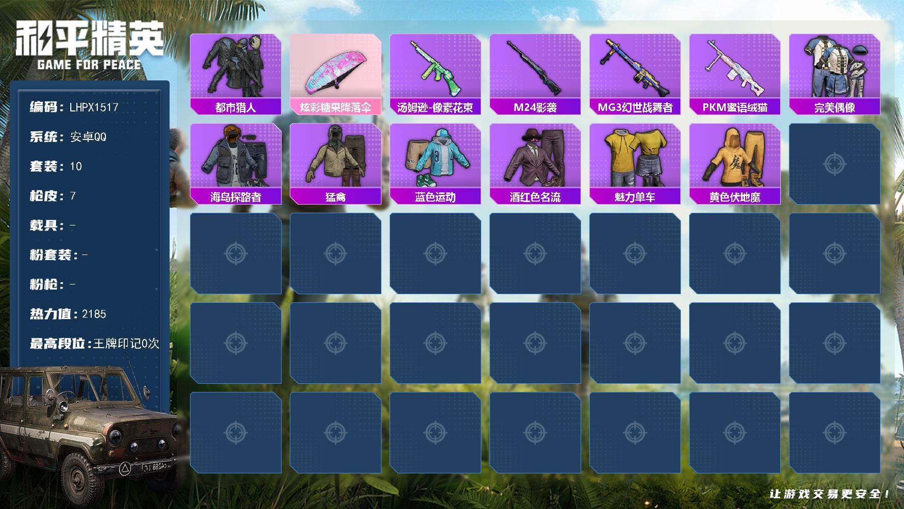 - [16335996]可二次【特价出售/店主推荐】安卓 微信-1神装-4粉装-4特效枪-4载具-2粉色飞行器-43370热力值-9王牌印记-69套装-116枪皮 【红色神装等级】:镜域双华-欧若拉(二级) 【红色角色神装】:镜域双华-欧若拉 【热门品类】:粉装-梦幻火箭,套装-龟仙人 【粉色套装】:粉装-梦幻火箭,粉装-青空秋雨,角色-月影灵韵,角色-晶梦幻蝶 【粉色枪皮等级】:M416-至情至圣(九级),M762-鬼刀(三级),Kar98K-巳巳如意(五级),M24-镜域双华(三级) 【粉色载具】:玛莎拉蒂MC20(星石白),双人摩托-梦幻火箭,快艇-自由的鲸,晶梦灵驹 【粉色枪皮】:M416-至情至圣,M762-鬼刀,Kar98K-巳巳如意,M24-镜域双华 【粉色飞行器】:梦幻火箭飞行器,镜域双华-灵镜之阶 【粉色降落伞】:梦幻火箭降落伞,环太平洋降落伞,垂柳戏鸭降落伞,彩虹甜喵降落伞,暗夜鎏金降落伞,仲夏莫吉托降落伞,镜域双华降落伞,晶梦幻蝶降落伞 【稀有套装】:套装-龟仙人,套装-巳巳如意,套装-燕燕于飞,套装-鱼渊荷华,套装-晶灵使者,套装-晶辉守护,套装-紫幽梦,套装-蓝冰羽,套装-星渊小夜曲 【稀有枪皮】:AKM-彩虹符号,M16A4-幻世战舞者,SCAR-L-玉兔迎春,M416-糯团青竹,M416-红色方程式,GROZA-异彩先驱,GROZA-田园牧歌,GROZA-晶梦幻蝶,AUG-天降萌叽,AUG-耀粉歌者,QBZ-银碳小老虎,M762-天降萌叽,M762-彩虹甜喵,M762-暗夜鎏金,Mk47-妙红点点,G36C-镜域双华,AC-VAL-天降萌叽,蜜獾-垂柳戏鸭,蜜獾-天降萌叽,蜜獾-娇憨猪猪,Famas-镜域双华,UZI-啾咪啾咪,UZI-天降萌叽,UZI-娇憨猪猪,UMP45-春暖花开,UMP45-生命誓言,Vector-焰鹰斗篷,Vector-生命誓言,Vector-田园牧歌,汤姆逊-耀粉歌者,P90-巳巳如意,Kar98K-梦幻火箭,M24-幻彩电音,AWM-焰鹰斗篷,SKS-糯团青竹,VSS-田园牧歌,VSS-黑色刀锋,Mini14-梦幻火箭,Mini14-炫彩节奏,Mini14-耀粉歌者,Win94-晶梦幻蝶,SLR-娇憨猪猪,AMR-妙红点点,S686-生命誓言,S686-巳巳如意,S1897-春暖花开,S1897-炫彩节奏,S12K-娇憨猪猪,S1