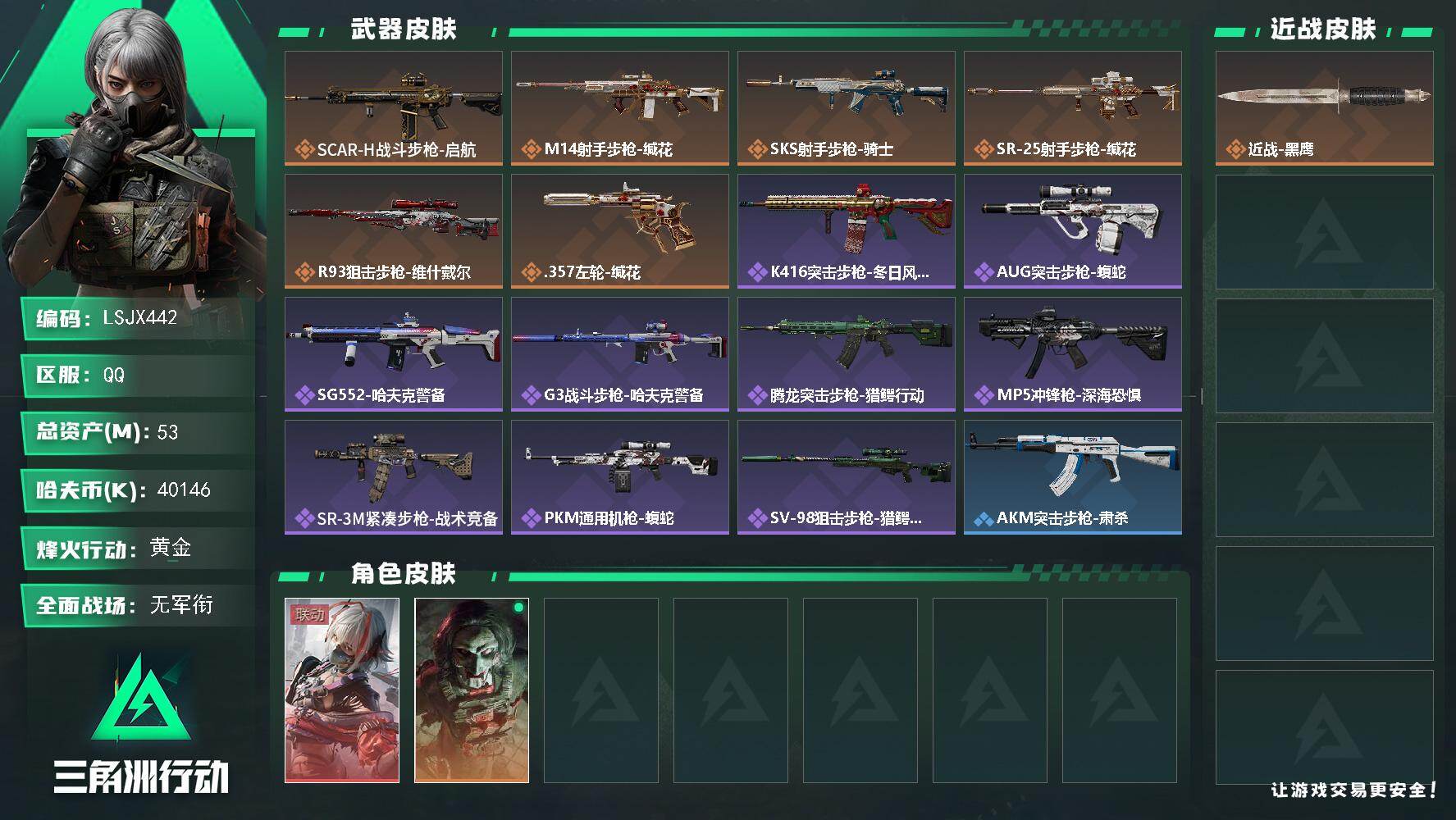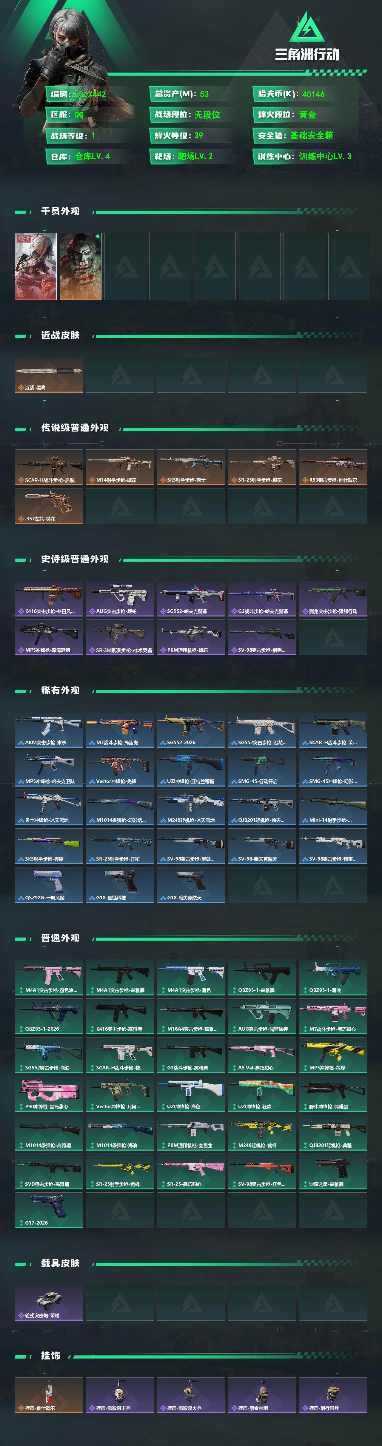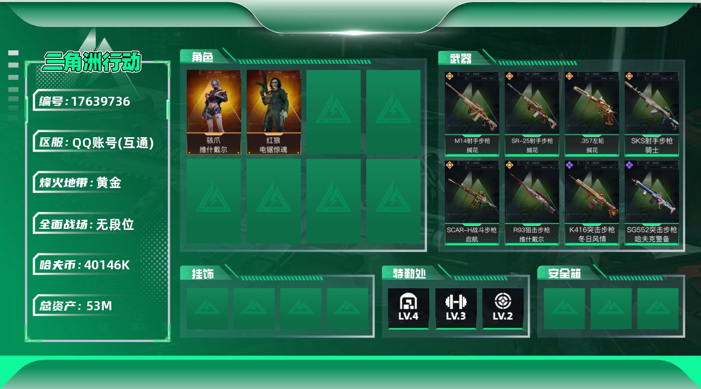 [17639736]【特价出售/店主推荐】53m总资产-40146k哈伏币-39烽火等级-黄金-1战场等级-无军衔 【干员外观】:骇爪-维什戴尔,红狼-电锯惊魂 【近战皮肤】:近战-黑鹰 【传说外观】:SCAR-H战斗步枪-启航,M14射手步枪-缄花,SKS射手步枪-骑士,SR-25射手步枪-缄花,R93狙击步枪-维什戴尔,.357左轮-缄花 【史诗外观】:K416突击步枪-冬日风情,AUG突击步枪-蝮蛇,SG552突击步枪-哈夫克警备,G3战斗步枪-哈夫克警备,腾龙突击步枪-猎鳄行动,MP5冲锋枪-深海恐惧,SR-3M紧凑突击步枪-战术竞备,PKM通用机枪-蝮蛇,SV-98狙击步枪-猎鳄行动 【稀有外观】:AKM突击步枪-肃杀,M7战斗步枪-捣蛋鬼,SG552突击步枪-2026,SG552突击步枪-贴花艺术,SCAR-H战斗步枪-荣耀列队,MP5冲锋枪-哈夫克卫队,Vector冲锋枪-先锋,UZI冲锋枪-亚特兰蒂斯,SMG-45冲锋枪-行动开启,SMG-45冲锋枪-幻影结构,勇士冲锋枪-冰天雪地,M1014霰弹枪-幻影结构,M249轻机枪-冰天雪地,QJB201轻机枪-哈夫克卫队,Mini-14射手步枪-荣耀列队,SKS射手步枪-弄臣,SR-25射手步枪-开拓,SV-98狙击步枪-星链科技,SV-98狙击步枪-哈夫克航天,SV-98狙击步枪-精英联盟,QSZ92G-一帆风顺,G18-星链科技,G18-哈夫克航天 【普通外观】:M4A1突击步枪-粉色涂装,M4A1突击步枪-高雅黑,M4A1突击步枪-海色,QBZ95-1突击步枪-高雅黑,QBZ95-1突击步枪-海浪,QBZ95-1突击步枪-2026,K416突击步枪-高雅黑,M16A4突击步枪-高雅黑,AUG突击步枪-浅蓝涂装,M7战斗步枪-黑巧甜心,SG552突击步枪-海浪,SCAR-H战斗步枪-数码迷彩,G3战斗步枪-高雅黑,AS Val突击步枪-黑巧甜心,MP5冲锋枪-黄蜂,P90冲锋枪-黑巧甜心,Vector冲锋枪-几何迷彩,UZI冲锋枪-海色,UZI冲锋枪-狂欢,野牛冲锋枪-高雅黑,M1014霰弹枪-高雅黑,M1014霰弹枪-海浪,PKM通用机枪-变色龙,M249轻机枪-黄蜂,QJB201轻机枪-典雅,SVD狙击步枪-高雅黑,SR-25射手步枪-黄蜂,SR-25射手步枪-黑巧甜心,SV-98狙击步枪-红色涂装,沙漠之鹰-高雅