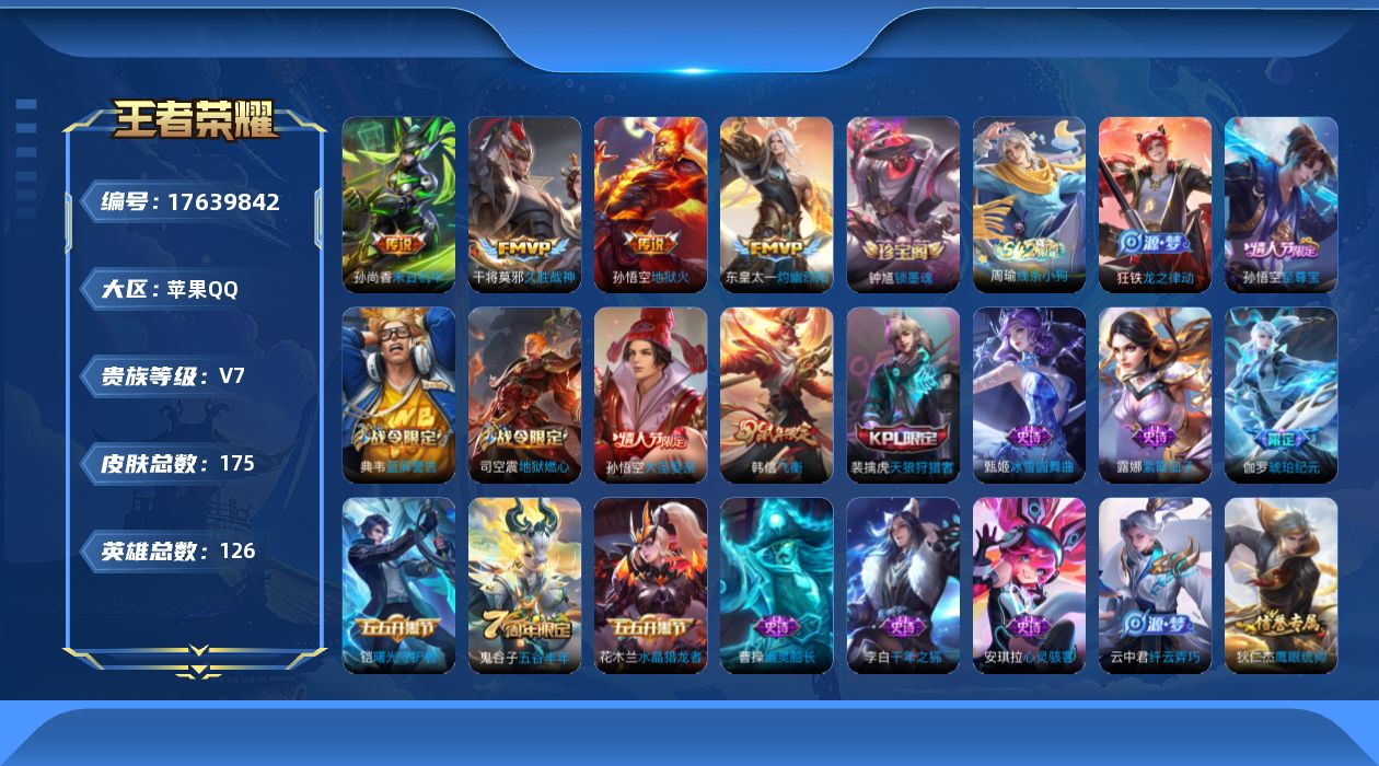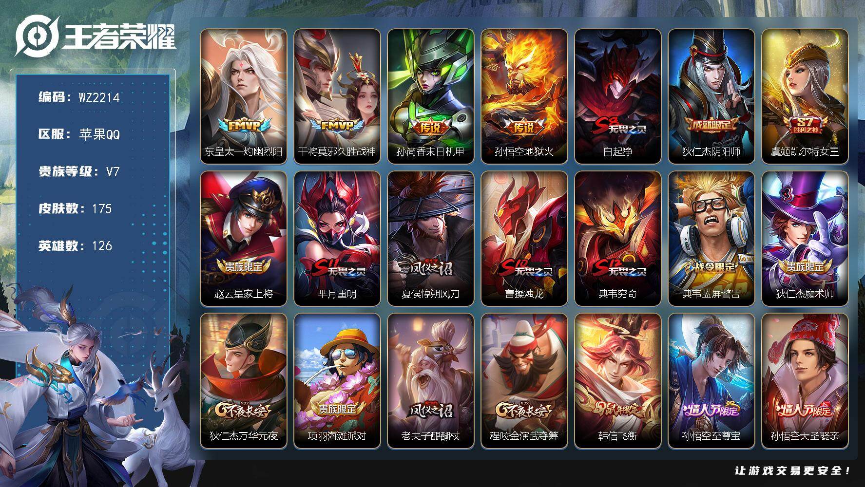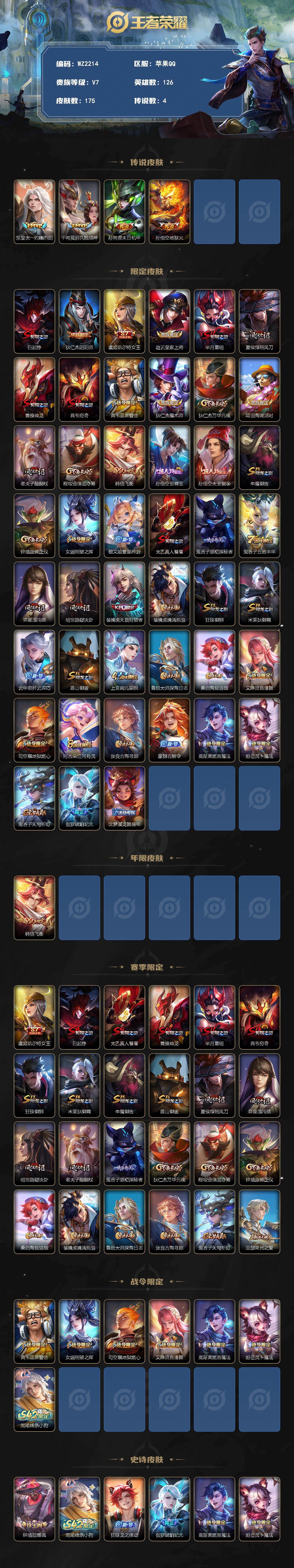[17639842]苹果Q-175皮肤-4传说-40史诗 【传说皮肤】:东皇太一灼幽烈阳,干将莫邪久胜战神,孙尚香末日机甲,孙悟空地狱火 【限定皮肤】:白起狰,狄仁杰阴阳师,虞姬凯尔特女王,赵云皇家上将,芈月重明,夏侯惇朔风刀,曹操烛龙,典韦穷奇,典韦蓝屏警告,狄仁杰魔术师,狄仁杰万华元夜,项羽海滩派对,老夫子醍醐杖,程咬金演武夺筹,韩信飞衡,孙悟空至尊宝,孙悟空大圣娶亲,牛魔御旌,钟馗驱傩正仪,女娲朔望之晖,蔡文姬繁星吟游,太乙真人饕餮,鬼谷子原初探秘者,鬼谷子五谷丰年,弈星混沌棋,明世隐疑决卦,裴擒虎天狼狩猎者,裴擒虎擒涛扼浪,狂铁御狮,米莱狄御霄,云中君纤云弄巧,盾山御銮,上官婉儿梁祝,鲁班大师探海日志,桑启海盐诗旅,艾琳流音漫舞,司空震地狱燃心,阿古朵江河有灵,张良古海寻踪,蒙犽百解令,高渐离燃音魔法,妲己灵卜魔法,鬼谷子天穹祈灯,伽罗琥珀纪元,沈梦溪龙舞盛年 【年限皮肤】:韩信飞衡 【赛季限定】:虞姬凯尔特女王,白起狰,太乙真人饕餮,曹操烛龙,芈月重明,典韦穷奇,狂铁御狮,米莱狄御霄,牛魔御旌,盾山御銮,夏侯惇朔风刀,弈星混沌棋,明世隐疑决卦,老夫子醍醐杖,鬼谷子原初探秘者,狄仁杰万华元夜,程咬金演武夺筹,钟馗驱傩正仪,桑启海盐诗旅,裴擒虎擒涛扼浪,鲁班大师探海日志,张良古海寻踪,鬼谷子天穹祈灯,亚瑟荣光之誓 【战令限定】:典韦蓝屏警告,女娲朔望之晖,司空震地狱燃心,艾琳流音漫舞,高渐离燃音魔法,妲己灵卜魔法,周瑜线条小狗 【史诗皮肤】:钟馗锁墨魂,周瑜线条小狗,狂铁龙之律动,伽罗琥珀纪元,高渐离燃音魔法,妲己灵卜魔法,蒙犽百解令,阿古朵江河有灵,司空震地狱燃心,鬼谷子五谷丰年,云中君纤云弄巧,韩信飞衡,蔡文姬繁星吟游,上官婉儿梁祝,狄仁杰鹰眼统帅,裴擒虎天狼狩猎者,典韦蓝屏警告,孙悟空大圣娶亲,程咬金功夫厨神,李元芳逐浪之夏,铠曙光守护者,百里守约特工魅影,安琪拉心灵骇客,诸葛亮黄金分割率,兰陵王暗隐猎兽者,花木兰水晶猎龙者,孙悟空至尊宝,韩信白龙吟,张飞乱世虎臣,李白千年之狐,曹操幽灵船长,刘禅绅士熊喵,墨子金属风暴,妲己魅力维加斯,孙尚香水果甜心,廉颇地狱岩魂,狄仁杰魔术师,王昭君偶像歌手,甄姬冰雪圆舞曲,赵云未来纪元,赵云皇家上将,露娜紫霞仙子 【其他皮肤】:虞姬溯影追猎,亚瑟荣光之誓,莱西奥踏浪烽翎,大司命暗都幽影,沈梦溪龙舞盛年,廉颇功夫炙烤,海诺时空谍影,妲己