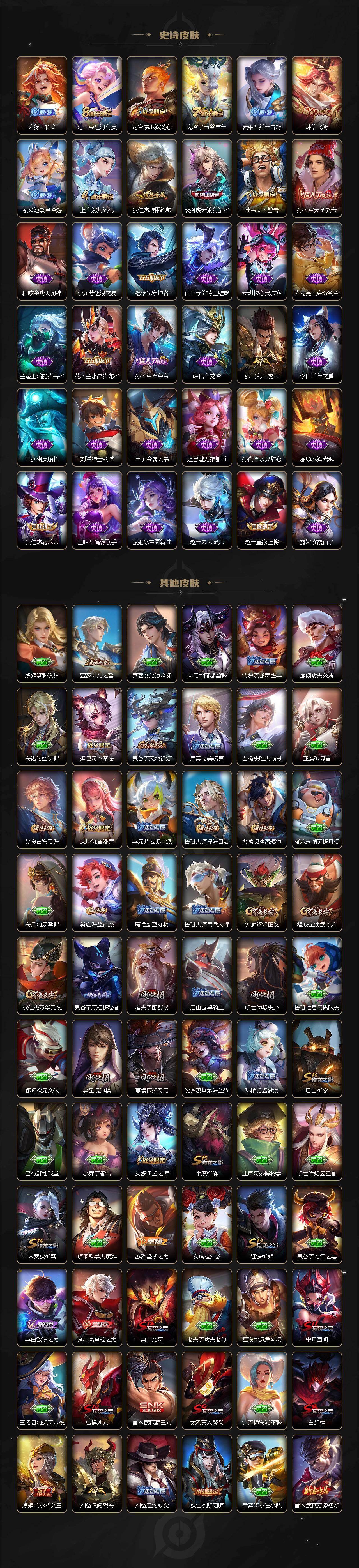 【史诗皮肤】:钟馗锁墨魂,周瑜线条小狗,狂铁龙之律动,伽罗琥珀纪元,高渐离燃音魔法,妲己灵卜魔法,蒙犽百解令,阿古朵江河有灵,司空震地狱燃心,鬼谷子五谷丰年,云中君纤云弄巧,韩信飞衡,蔡文姬繁星吟游,上官婉儿梁祝,狄仁杰鹰眼统帅,裴擒虎天狼狩猎者,典韦蓝屏警告,孙悟空大圣娶亲,程咬金功夫厨神,李元芳逐浪之夏,铠曙光守护者,百里守约特工魅影,安琪拉心灵骇客,诸葛亮黄金分割率,兰陵王暗隐猎兽者,花木兰水晶猎龙者,孙悟空至尊宝,韩信白龙吟,张飞乱世虎臣,李白千年之狐,曹操幽灵船长,刘禅绅士熊喵,墨子金属风暴,妲己魅力维加斯,孙尚香水果甜心,廉颇地狱岩魂,狄仁杰魔术师,王昭君偶像歌手,甄姬冰雪圆舞曲,赵云未来纪元,赵云皇家上将,露娜紫霞仙子