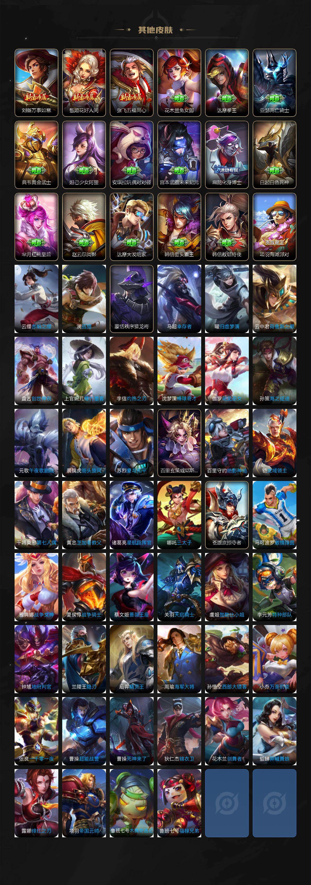 【限定皮肤】:白起狰,狄仁杰阴阳师,虞姬凯尔特女王,赵云皇家上将,芈月重明,夏侯惇朔风刀,曹操烛龙,典韦穷奇,典韦蓝屏警告,狄仁杰魔术师,狄仁杰万华元夜,项羽海滩派对,老夫子醍醐杖,程咬金演武夺筹,韩信飞衡,孙悟空至尊宝,孙悟空大圣娶亲,牛魔御旌,钟馗驱傩正仪,女娲朔望之晖,蔡文姬繁星吟游,太乙真人饕餮,鬼谷子原初探秘者,鬼谷子五谷丰年,弈星混沌棋,明世隐疑决卦,裴擒虎天狼狩猎者,裴擒虎擒涛扼浪,狂铁御狮,米莱狄御霄,云中君纤云弄巧,盾山御銮,上官婉儿梁祝,鲁班大师探海日志,桑启海盐诗旅,艾琳流音漫舞,司空震地狱燃心,阿古朵江河有灵,张良古海寻踪,蒙犽百解令,高渐离燃音魔法,妲己灵卜魔法,鬼谷子天穹祈灯,伽罗琥珀纪元,沈梦溪龙舞盛年