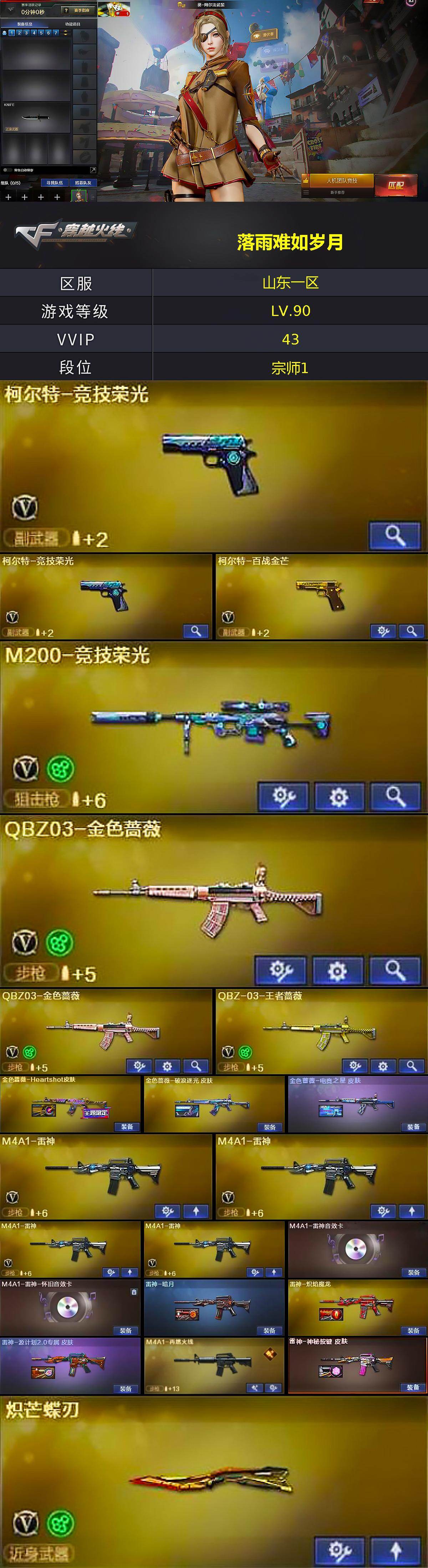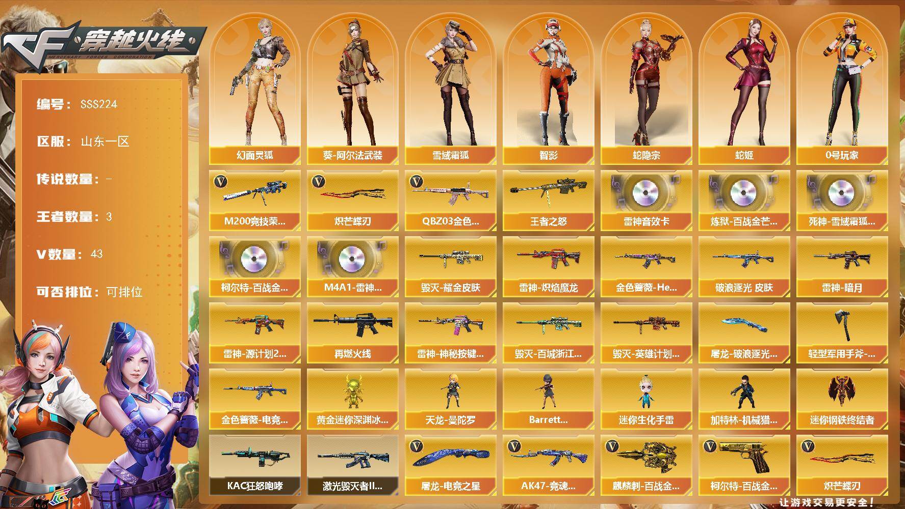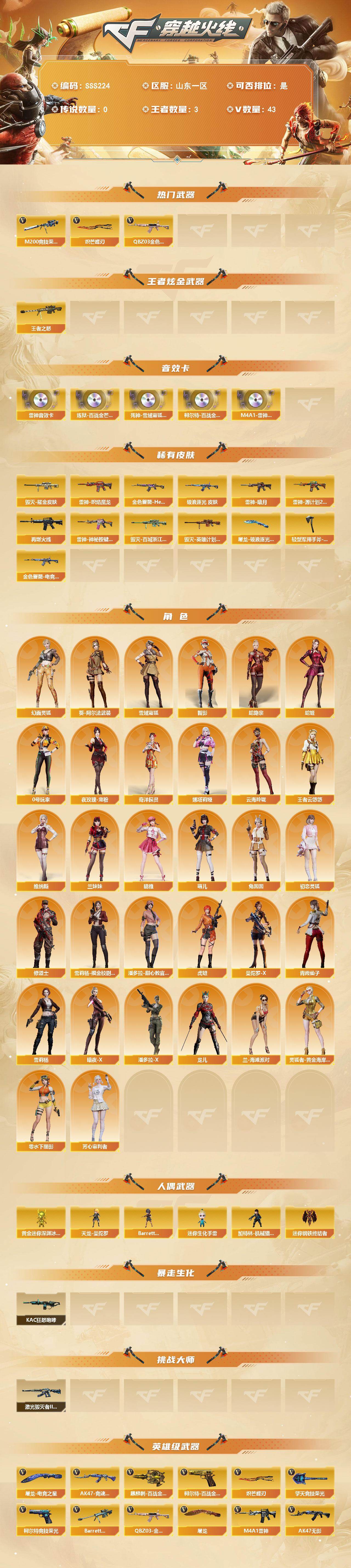 [17639961]山东一区-44V-3王者武器数-0炫金武器数 【热门武器】:QBZ03-金色蔷薇*2,M200-竞技荣光,炽芒蝶刃 【王者炫金武器】:王者之怒 【音效卡】:M4A1-雷神音效卡,炼狱-百战金芒-庆典舞曲音效卡,死神-雪域霜狐-怀旧音效卡,柯尔特-百战金芒-庆典舞曲音效卡,M4A1-雷神-怀旧音效卡 【皮肤】:金色蔷薇-Heartshot皮肤,金色蔷薇-破浪逐光 皮肤,金色蔷薇-电竞之星 皮肤,雷神-暗月,雷神-炽焰魔龙,雷神-源计划2.0专属 皮肤,M4A1-再燃火线,雷神-神秘按键 皮肤,毁灭耀金皮肤,毁灭-百城浙江 皮肤,毁灭-英雄计划 皮肤,屠龙-破浪逐光 皮肤,轻型军用手斧-再燃火线 【角色】:晴雅,王者云悠悠,雪域霜狐,蛇隐宗,奇洋探员,修道士,云海玲珑,葵-阿尔法武装,幻面灵狐,暗夜-X,初恋灵狐,芳心审判者,虎妞,兰-海滩派对,兰妹妹,0号玩家,零-水下丽影,灵狐者-黄金海岸,龙儿,曼陀罗-X,萌儿,娜塔莉娅,潘多拉-X,潘多拉-甜心教官,青霞仙子,蛇姬,兔囡囡,维纳斯,雪莉杨,雪莉杨-摸金校尉,夜玫瑰-宠粉,智影 【人偶武器】:天龙-曼陀罗,迷你钢铁终结者,Barrett-战龙-灵狐者,加特林-机械猎手,黄金迷你深渊冰龙,迷你生化手雷 【暴走生化】:KAC-狂怒咆哮 【挑战大师】:激光毁灭者III-白马银枪 【英雄级武器】:AK47-火麒麟,M4A1-雷神*4,AK47-无影,黑武士-锦绣游龙,死神-雪域霜狐,QBZ03-金色蔷薇*2,QBZ-03-王者蔷薇-觉醒版,HK417-朱雀-电竞之星,机械迷城-穹宇,Barrett-毁灭*2,M200-竞技荣光,王者之力-觉醒版,Barrett-暗月传说,炼狱-百战金芒,柯尔特-竞技荣光*2,柯尔特-百战金芒,屠龙,擎天-竞技荣光*2,炽芒蝶刃,麒麟刺-百战金芒,屠龙-电竞之星,高爆手雷-竞技荣光*3,闪光弹-竞技荣光*3,烟雾弹-竞技荣光*4,烟雾弹-古蛇迷踪,M4A1-赤狱骑士,AK47-竞魂无影 【源级武器】:源·雷神,魂·雷神-诺拉,魂·雷神-神秘按键,魂·雷神-萌柴,雷神-极氪汽车,源·黑骑士,魂·黑骑士-幻能朋克,魂·黑骑士-破浪10年*2,御·黑骑士·哪吒闹海,无影-波塞冬,魂-死神-机甲核心,魂·黑武士-锋芒破茧,御·超新星-圣诞,源·武圣*2,源·机械迷城,魂·龙血-锋芒破茧,魂·HK4