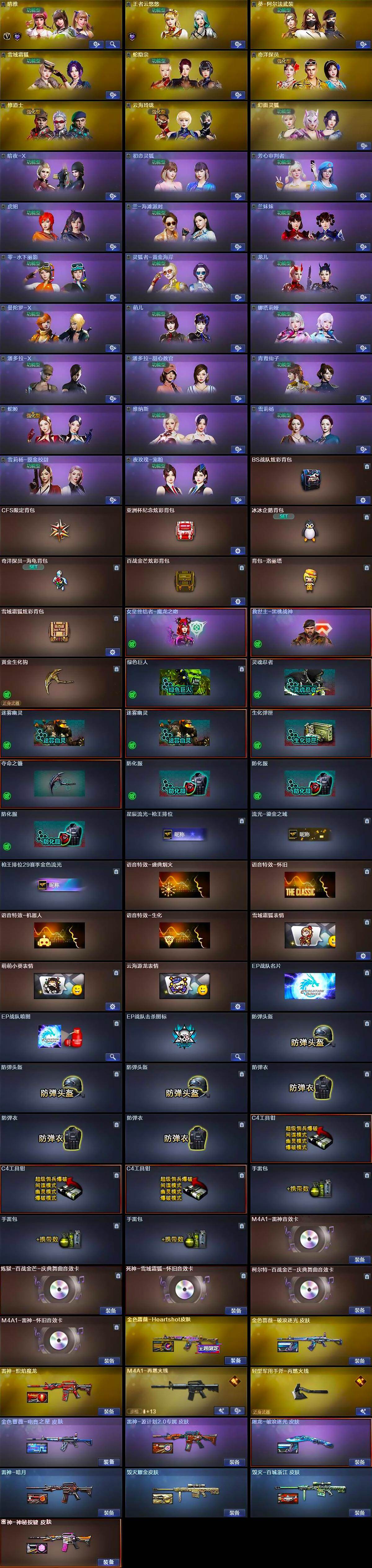 【英雄级武器】:AK47-火麒麟,M4A1-雷神*4,AK47-无影,黑武士-锦绣游龙,死神-雪域霜狐,QBZ03-金色蔷薇*2,QBZ-03-王者蔷薇-觉醒版,HK417-朱雀-电竞之星,机械迷城-穹宇,Barrett-毁灭*2,M200-竞技荣光,王者之力-觉醒版,Barrett-暗月传说,炼狱-百战金芒,柯尔特-竞技荣光*2,柯尔特-百战金芒,屠龙,擎天-竞技荣光*2,炽芒蝶刃,麒麟刺-百战金芒,屠龙-电竞之星,高爆手雷-竞技荣光*3,闪光弹-竞技荣光*3,烟雾弹-竞技荣光*4,烟雾弹-古蛇迷踪,M4A1-赤狱骑士,AK47-竞魂无影