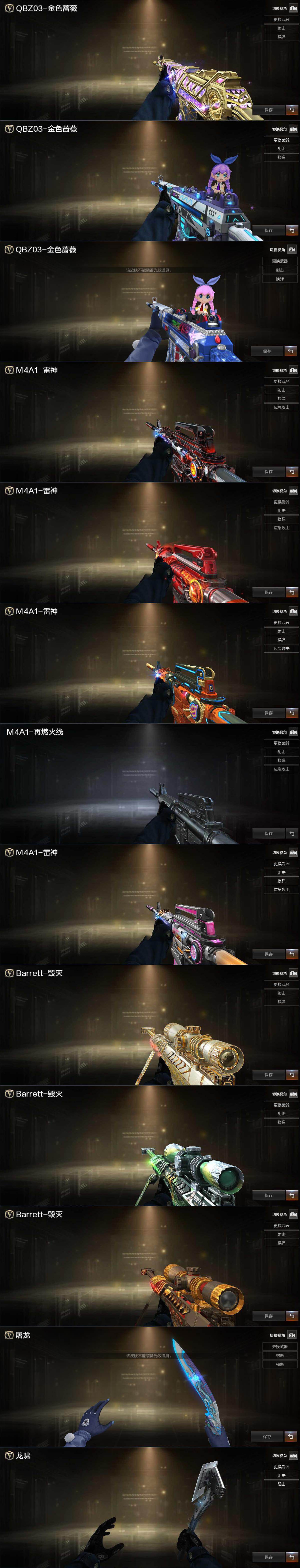 【皮肤】:金色蔷薇-Heartshot皮肤,金色蔷薇-破浪逐光 皮肤,金色蔷薇-电竞之星 皮肤,雷神-暗月,雷神-炽焰魔龙,雷神-源计划2.0专属 皮肤,M4A1-再燃火线,雷神-神秘按键 皮肤,毁灭耀金皮肤,毁灭-百城浙江 皮肤,毁灭-英雄计划 皮肤,屠龙-破浪逐光 皮肤,轻型军用手斧-再燃火线