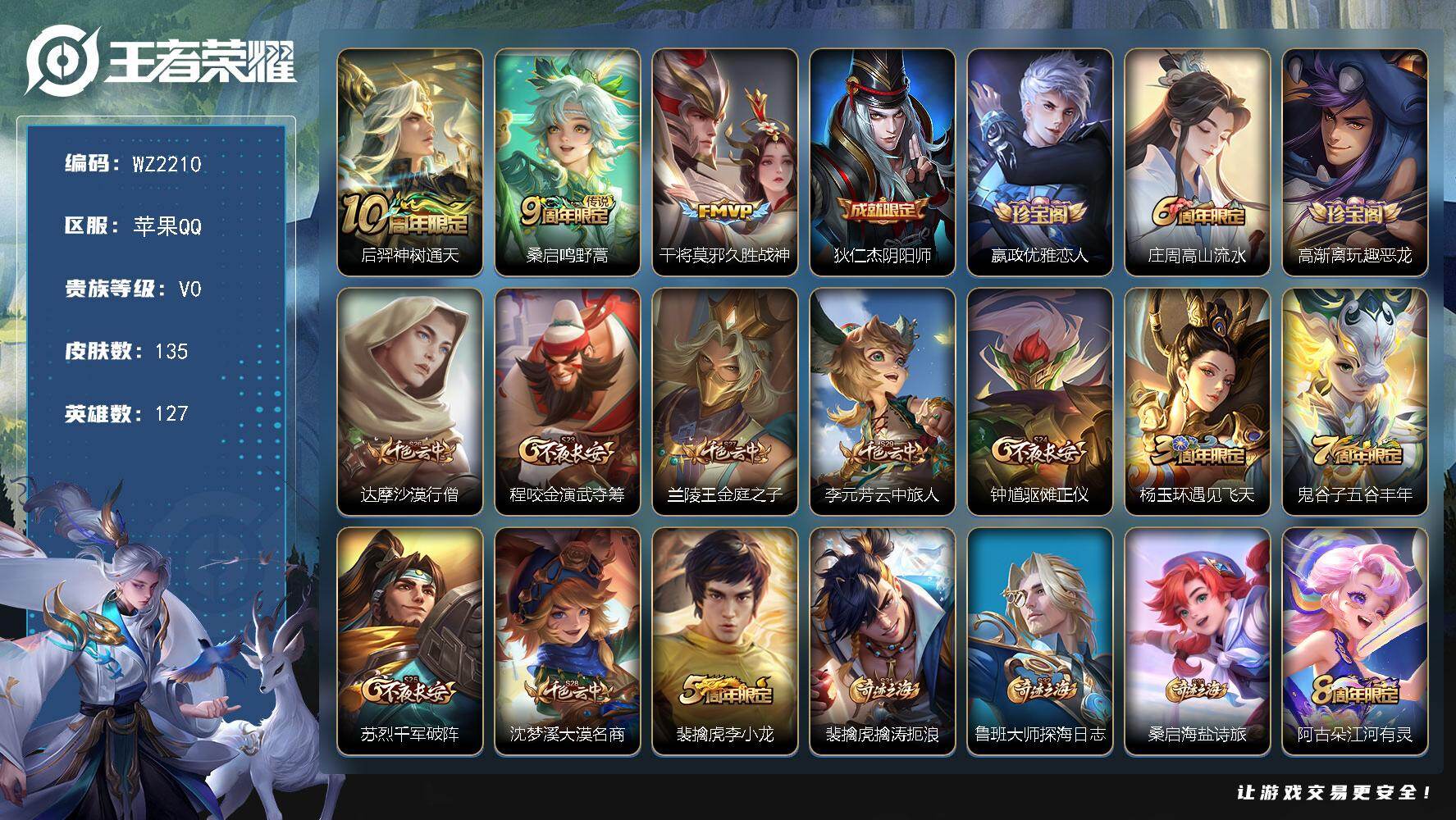 - [12116553]V7 1珍品传说 5传说 123英雄 188皮肤 可修改实名 优质装备:怪盗基德,超时空战士-狄仁杰,涂山容容 传说皮:幻光神枪 珍宝阁皮:万物之道,蔷薇恋人 限定皮:愿照·岁时盈(虞姬年限),鸣野蒿,瑞麟志(木兰年限),五谷丰年,游园惊梦,李小龙,大圣娶亲,深海之息(深海大菠萝) 史诗皮:器灵·浮梦炉,龙之律动,琥珀纪元伽罗,百相守梦-黄忠,蒙犽顽岩魄,怒海争锋,织梦人,紫霞仙子,电玩小子(小书包),白龙吟,黄金分割率,特工魅影,千年之狐,江河有灵,雪夜绮愿(周瑜),百解令(蒙犽),高渐离燃音魔法,蒙恬荣光圣徽,电玩·爆裂旋风,末日机甲-吕布,猫狗日记-大乔,乱世虎臣,节奏热浪,修罗,摇滚巨星,水果甜心,星夜王子,德古拉伯爵,暗隐猎兽者,幽灵船长,鬼剑武藏,心灵战警,纤云弄巧,缤纷独角兽,乘风破浪,逐浪之夏,水晶猎龙者,曙光守护者,箭羽风息,金属风暴,圣诞恋歌,鹰眼统帅,魅力维加斯,未来纪元-赵云