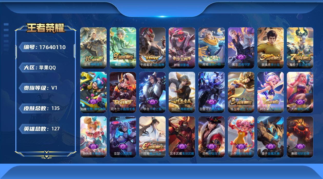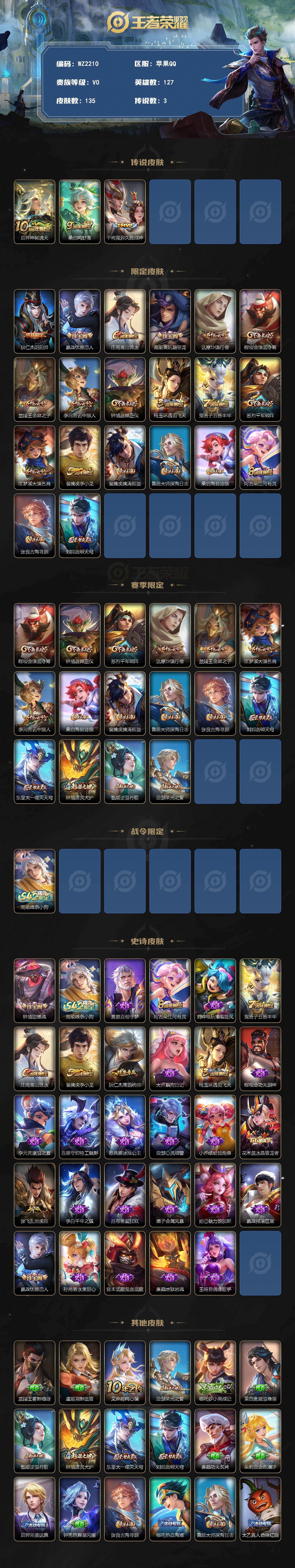 [17640110]苹果Q-135皮肤-3传说-28史诗 【传说皮肤】:后羿神树通天,桑启鸣野蒿,干将莫邪久胜战神 【限定皮肤】:狄仁杰阴阳师,嬴政优雅恋人,庄周高山流水,高渐离玩趣恶龙,达摩沙漠行僧,程咬金演武夺筹,兰陵王金庭之子,李元芳云中旅人,钟馗驱傩正仪,杨玉环遇见飞天,鬼谷子五谷丰年,苏烈千军破阵,沈梦溪大漠名商,裴擒虎李小龙,裴擒虎擒涛扼浪,鲁班大师探海日志,桑启海盐诗旅,阿古朵江河有灵,张良古海寻踪,刘邦剑破天穹 【赛季限定】:程咬金演武夺筹,钟馗驱傩正仪,苏烈千军破阵,达摩沙漠行僧,兰陵王金庭之子,沈梦溪大漠名商,李元芳云中旅人,桑启海盐诗旅,裴擒虎擒涛扼浪,鲁班大师探海日志,张良古海寻踪,刘邦剑破天穹,东皇太一噬灭天穹,钟馗虚灵犬护,甄姬逆浪荇歌,亚瑟荣光之誓 【战令限定】:周瑜线条小狗 【史诗皮肤】:钟馗锁墨魂,周瑜线条小狗,黄忠百相守梦,阿古朵江河有灵,刘禅电玩爆裂旋风,鬼谷子五谷丰年,庄周高山流水,裴擒虎李小龙,狄仁杰鹰眼统帅,大乔猫狗日记,杨玉环遇见飞天,程咬金功夫厨神,李元芳逐浪之夏,百里守约特工魅影,雅典娜冰冠公主,亚瑟心灵战警,小乔缤纷独角兽,花木兰水晶猎龙者,张飞乱世虎臣,李白千年之狐,吕布圣诞狂欢,墨子金属风暴,妲己魅力维加斯,嬴政摇滚巨星,嬴政优雅恋人,孙尚香水果甜心,宫本武藏鬼剑武藏,廉颇地狱岩魂,王昭君偶像歌手 【其他皮肤】:兰陵王雾影缉谜,虞姬溯影追猎,艾琳鹤鸣心笺,亚瑟荣光之誓,哪吒罗小黑战记,莱西奥踏浪烽翎,甄姬逆浪荇歌,钟馗虚灵犬护,东皇太一噬灭天穹,刘邦剑破天穹,廉颇功夫炙烤,朵莉亚金色潮汐,后羿完美运算,钟无艳聚星闪耀,张良古海寻踪,哪吒热血海滩,鲁班大师探海日志,太乙真人劲辣红锅,裴擒虎擒涛扼浪,猪八戒潮玩探月行,桑启海盐诗旅,李元芳云中旅人,蒙恬蔚蓝守将,沈梦溪大漠名商,刘禅唤灵魔甲,兰陵王金庭之子,刘邦虎啸剑宗,程咬金无双福将,达摩沙漠行僧,苏烈千军破阵,鲁班大师乓乓大师,钟馗驱傩正仪,程咬金演武夺筹,刘禅秘密基地,狂铁特工战影,盾山圆桌骑士,哪吒次元突破,沈梦溪鲨炮海盗猫,高渐离玩趣恶龙,孙膑归虚梦演,吕布野性能量,明世隐虹云星官,大乔守护之力,苏烈坚韧之力,鬼谷子幻乐之宴,孙尚香沉稳之力,老夫子功夫老勺,王昭君幻想奇妙夜,钟无艳海滩丽影,关羽龙腾万里,刘备纽约教父,狄仁杰阴阳师,后羿阿尔法小队,宫本武藏万象初新,刘备万事