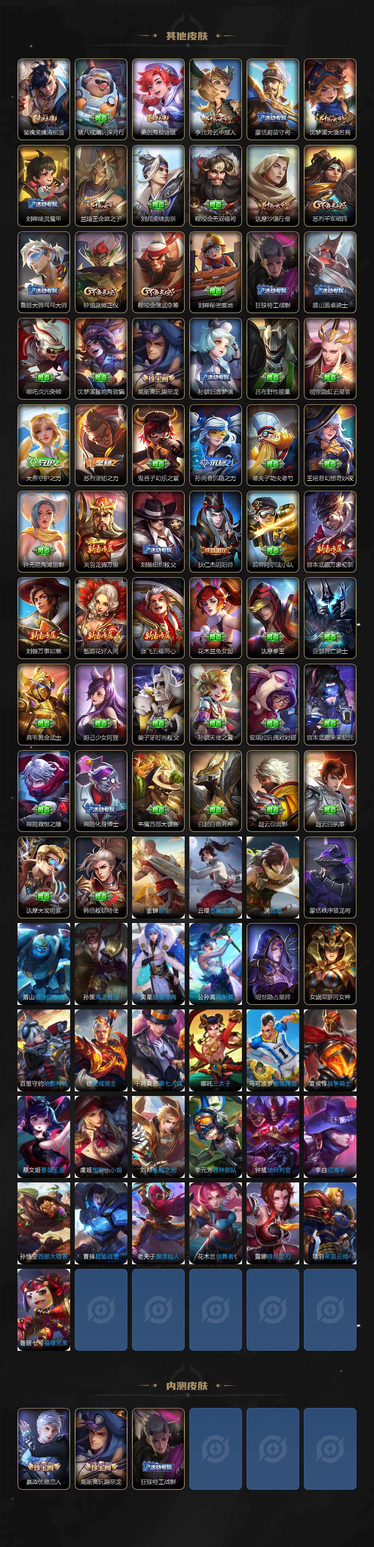 【其他皮肤】:兰陵王雾影缉谜,虞姬溯影追猎,艾琳鹤鸣心笺,亚瑟荣光之誓,哪吒罗小黑战记,莱西奥踏浪烽翎,甄姬逆浪荇歌,钟馗虚灵犬护,东皇太一噬灭天穹,刘邦剑破天穹,廉颇功夫炙烤,朵莉亚金色潮汐,后羿完美运算,钟无艳聚星闪耀,张良古海寻踪,哪吒热血海滩,鲁班大师探海日志,太乙真人劲辣红锅,裴擒虎擒涛扼浪,猪八戒潮玩探月行,桑启海盐诗旅,李元芳云中旅人,蒙恬蔚蓝守将,沈梦溪大漠名商,刘禅唤灵魔甲,兰陵王金庭之子,刘邦虎啸剑宗,程咬金无双福将,达摩沙漠行僧,苏烈千军破阵,鲁班大师乓乓大师,钟馗驱傩正仪,程咬金演武夺筹,刘禅秘密基地,狂铁特工战影,盾山圆桌骑士,哪吒次元突破,沈梦溪鲨炮海盗猫,高渐离玩趣恶龙,孙膑归虚梦演,吕布野性能量,明世隐虹云星官,大乔守护之力,苏烈坚韧之力,鬼谷子幻乐之宴,孙尚香沉稳之力,老夫子功夫老勺,王昭君幻想奇妙夜,钟无艳海滩丽影,关羽龙腾万里,刘备纽约教父,狄仁杰阴阳师,后羿阿尔法小队,宫本武藏万象初新,刘备万事