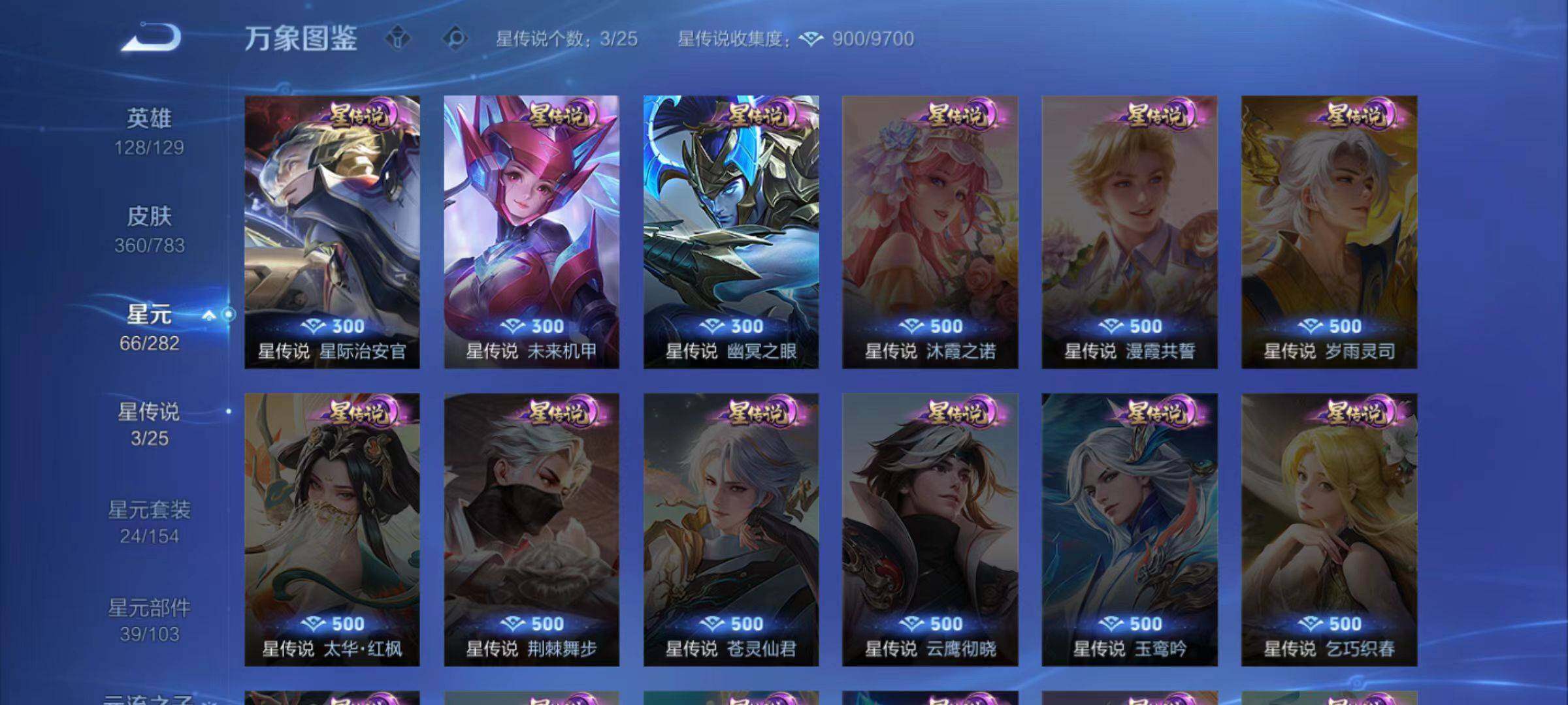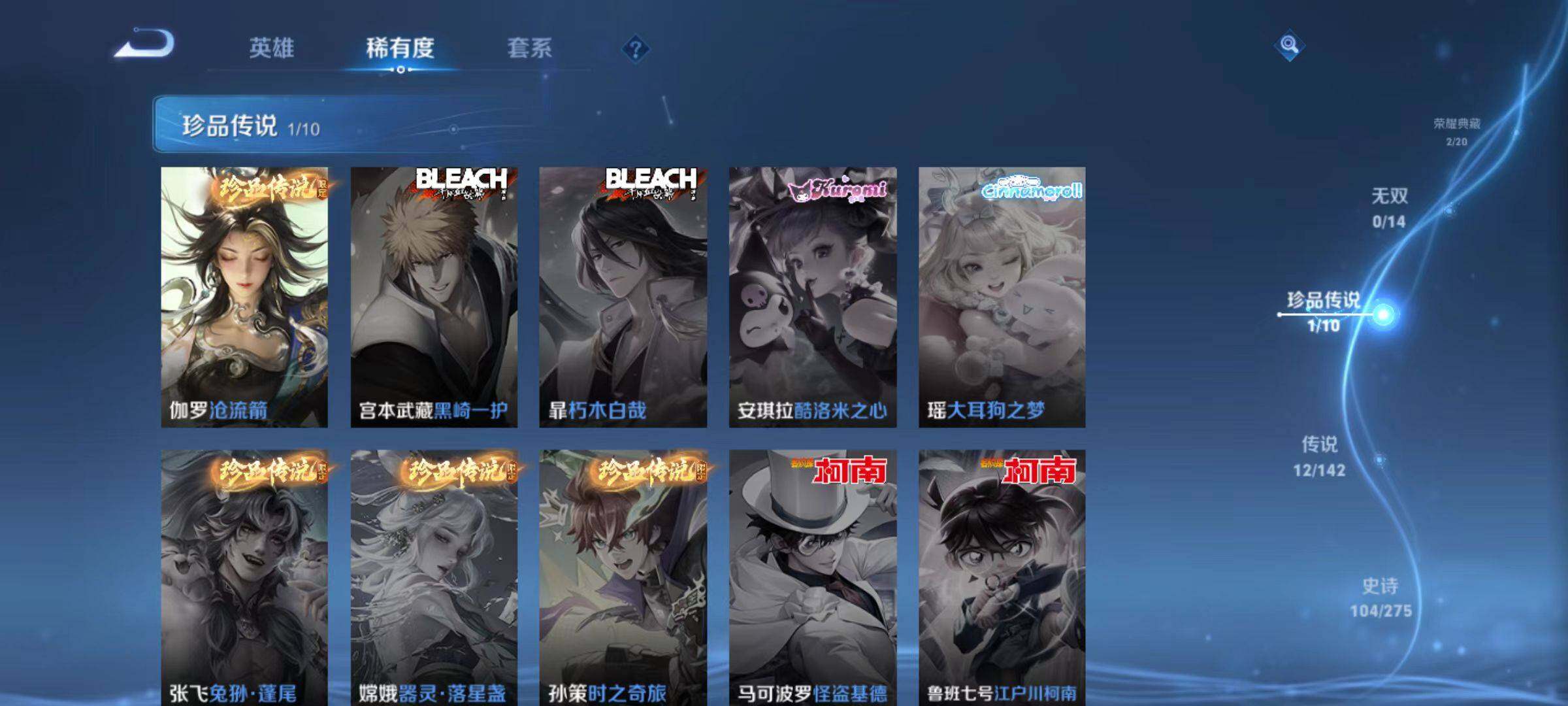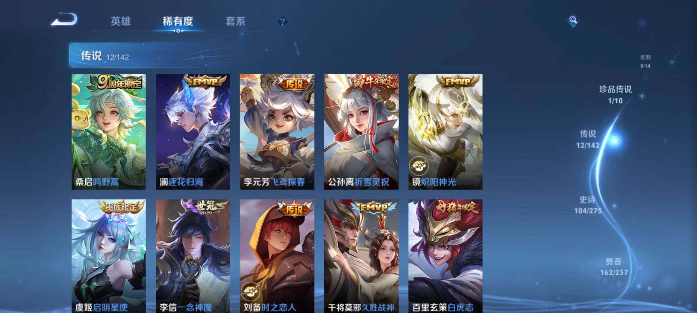 【传说皮肤】:桑启鸣野蒿,澜逐花归海,李元芳飞鸢探春,公孙离祈雪灵祝,镜炽阳神光,虞姬启明星使,李信一念神魔,刘备时之恋人,干将莫邪久胜战神,百里玄策白虎志,后羿黄金射手座,狄仁杰超时空战士