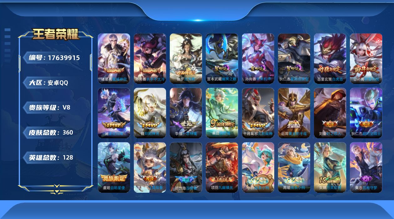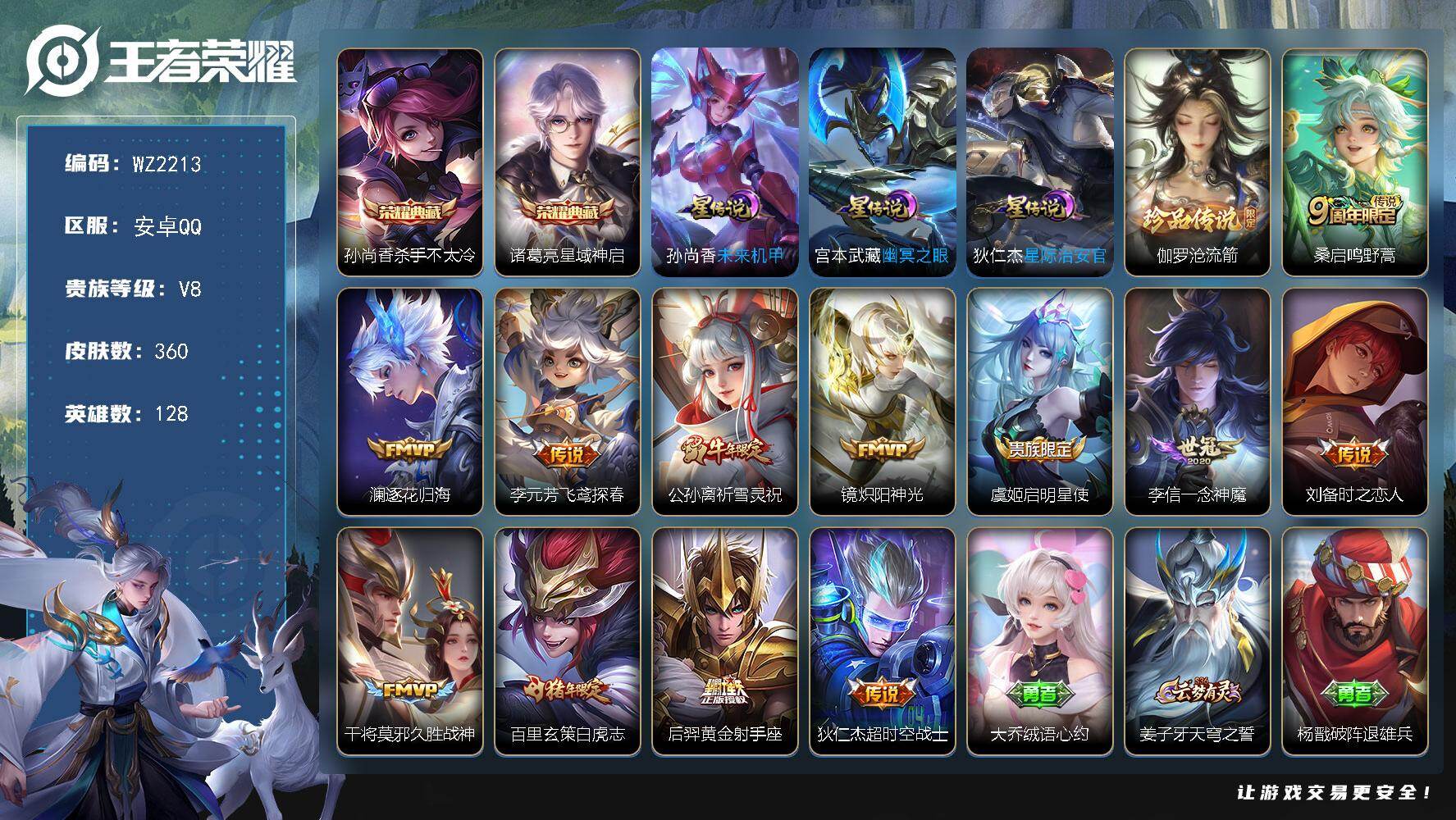 - [15081308]可二次【店主推荐捡漏号!可直接换绑】安卓Q-V8-最强王者段位-126英雄-262皮肤-1典藏皮肤-1珍品传说-22传说-81史诗-1星元 【英雄全皮】:刘备全皮,李信全皮,蒙恬全皮,戈娅全皮,影全皮 【荣耀典藏】:铠银白咏叹调 【珍品传说】:张飞兔狲蓬尾 【传说皮肤】:妲己愿照众生和,虞姬愿照岁时盈,云缨幻光神枪,桑启鸣野蒿,墨子黄金天蝎座,典韦战鼓燎原,鲁班七号时之奇旅,孙悟空齐天大圣,李信山海炽霜斩,吕布怒海麟威,百里守约碎云,孙策末日机甲,小乔音你心动,镜炽阳神光,虞姬启明星使,李信一念神魔,刘备时之恋人,虞姬云霓雀翎,貂蝉仲夏夜之梦,宫本武藏地狱之眼,孙悟空地狱火,吕布天魔缭乱 【限定皮肤】:蒙犽顽岩魄,蔡文姬夏日便利店,虞姬夏日便利店,姜子牙天穹之誓,杨戬破阵退雄兵,狄仁杰阴阳师,赵云皇家上将,鲁班七号时之奇旅,钟无艳超时空战士,扁鹊奇幻香踪,吕布天魔缭乱,元歌无心,典韦蓝屏警告,马可波罗山海玄木吟,狄仁杰魔术师,项羽海滩派对,孙悟空至尊宝,孙悟空孙行者,孙悟空齐天大圣,刘备百相守梦,李元芳银河之约,李元芳云中旅人,虞姬启明星使,杨戬潮玩骑兵,鬼谷子五谷丰年,黄忠火炮绅士,裴擒虎李小龙,裴擒虎擒涛扼浪,狂铁电玩高手,李信山海炽霜斩,嫦娥暖冬兔眠,西施玲珑珍味,鲁班大师探海日志,桑启海盐诗旅,暃星界游侠,戈娅驭风魔法,艾琳流音漫舞,司空震地狱燃心,阿古朵江河有灵,张良古海寻踪,蒙恬荣光圣徽,鬼谷子天穹祈灯,姬小满妄想食味,沈梦溪龙舞盛年,鲁班七号蔬乡物语,李元芳蔬乡物语,刘邦剑破天穹,程咬金群星魔术团,镜青焰无极,项羽苍威无极,刘备异域游侠,周瑜熔金海岸 【年限皮肤】:马可波罗山海玄木吟,李信山海炽霜斩 【赛季限定】:张良古海寻踪,李元芳云中旅人,裴擒虎擒涛扼浪,鲁班大师探海日志,桑启海盐诗旅,鬼谷子天穹祈灯,蒙恬荣光圣徽,刘邦剑破天穹,姜子牙天穹之誓 【战令限定】:蔡文姬夏日便利店,虞姬夏日便利店,钟无艳超时空战士,扁鹊奇幻香踪,典韦蓝屏警告,艾琳流音漫舞,李元芳银河之约,杨戬潮玩骑兵,黄忠火炮绅士,狂铁电玩高手,嫦娥暖冬兔眠,西施玲珑珍味,司空震地狱燃心,暃星界游侠,戈娅驭风魔法,鲁班七号蔬乡物语,李元芳蔬乡物语,镜青焰无极,项羽苍威无极 【史诗皮肤】:鲁班七号电玩小子,露娜紫霞仙子,赵云皇家上将,赵云未来纪元,甄姬冰雪圆舞曲,王昭君偶像歌手,狄仁杰