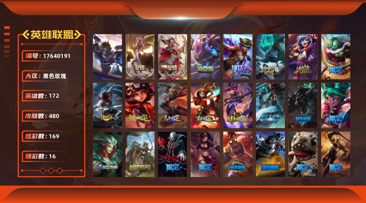 [17640191]未定级段位-172英雄-480皮肤-169炫彩-1终极-7神话-89限定-38传说-113史诗
