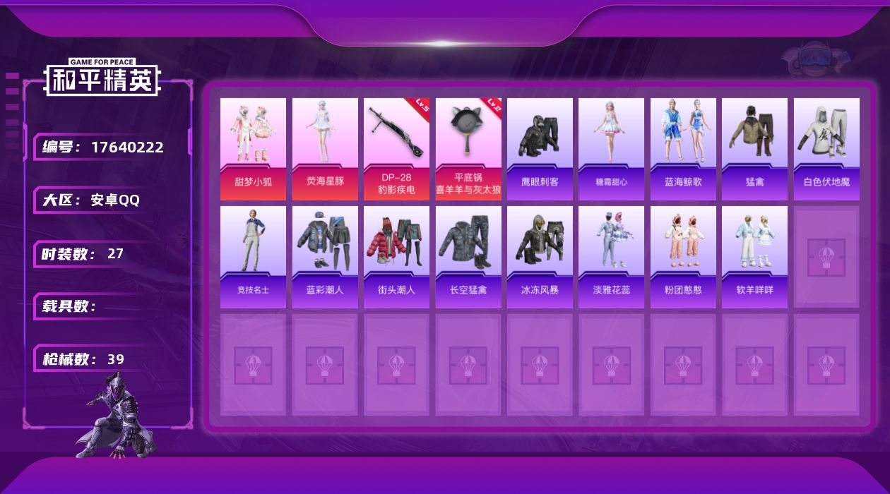 [17640222]【特价出售/店主推荐】安卓 手Q-2粉装-2特效枪-0载具-0粉色飞行器-10351热力值-1王牌印记-27套装-39枪皮【粉色套装】:粉装-甜梦小狐,角色-荧海星豚【粉色枪皮等级】:DP-28-豹影疾电(五级),平底锅-喜羊羊与灰太狼(二级)【粉色枪皮】:DP-28-豹影疾电,平底锅-喜羊羊与灰太狼