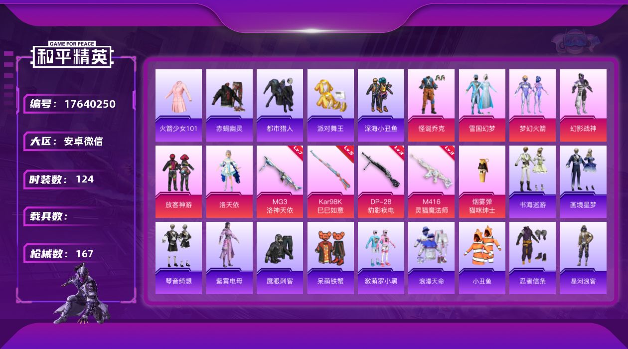 - [17519003]安卓 手Q-8粉装-9特效枪-1载具-5粉色飞行器-84050热力值-9王牌印记-213套装-258枪皮【热门品类】:粉装-梦幻火箭,粉装-音爆索尼克,套装-小丑鱼,套装-忍者信条,套装-龟仙人,套装-暗影哥特【粉色套装】:粉装-数码大师,粉装-金曜白虎,粉装-梦幻火箭,粉装-天启纪元,粉装-智能音符,粉装-星之彼岸,粉装-音爆索尼克,粉装-蜜语绒猫【粉色枪皮等级】:M416-五爪金龙(七级),M416-风花雪月(一级),ACE32-萌骑漫游(二级),AKS-74U-森灵之息(五级),P90-能量风暴(五级),Kar98K-巳巳如意(五级),Mk14-福马献瑞(五级),DP-28-豹影疾电(五级),MG3-梦幻舞会(四级)【粉色载具】:玛莎拉蒂Ghibli(蓝)【粉色枪皮】:M416-五爪金龙,M416-风花雪月,ACE32-萌骑漫游,AKS-74U-森灵之息,P90-能量风暴,Kar98K-巳巳如意,Mk14-福马献瑞,DP-28-豹影疾电,MG3-梦幻舞会【粉色飞行器】:炫彩糖果飞行器,精灵迷巫飞行器,星之彼岸飞行器,极意拳锋飞行器