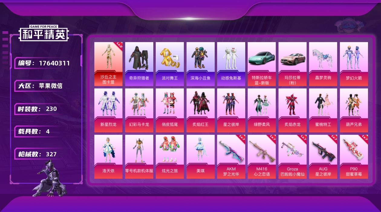 [17640311]【店主推荐捡漏号!可直接换绑】苹果 微信-1神装-14粉装-16特效枪-4载具-13粉色飞行器-118813热力值-16王牌印记-230套装-327枪皮【红色神装等级】:沙丘之主-图卡盟(二级)【红色角色神装】:沙丘之主-图卡盟【热门品类】:粉装-梦幻火箭,套装-浪漫天命,套装-派对舞王,套装-深海小丑鱼,套装-小丑鱼,套装-奇异狩猎者,套装-动感兔斯基人偶服,旭日初心兜帽大衣,套装-龟仙人,套装-潮萌小黄鸭,套装-浪漫波比,套装-粉红小猪,角色-8号机,角色-Mark.06【粉色套装】:粉装-梦幻火箭,粉装-新星烈龙,粉装-幻彩马卡龙,粉装-俏皮狐尾,粉装-炙焰红王,粉装-星之彼岸,粉装-绿野柔风,粉装-炙焰赤龙,粉装-蜜桃特工,粉装-葫芦兄弟,角色-洛天依,角色-零号机款机体服,粉装-炫光之旅,角色-美琪【粉色枪皮等级】:AKM-梦之光华(七级),SCAR-L-锦绣绵绵(五级),M416-心之恋语(七级),GROZA-巴啦啦小魔仙(七级),GROZA-精灵之光(三级),AUG-星之彼岸(七级),ACE32-萌骑漫游(四级),UMP45-量子极限(五级),AKS-74U-森灵之息(五级),P90-甜蜜草莓(七级),Kar98K-巳巳如意(五级),Mk14-甜梦熊击(五级),M417-第五大道(七级),DP-28-豹影疾电(五级),MG-36-沧焰双生(五级),破片手榴弹-招财进宝(五级)【粉色载具】:特斯拉Roadster(水滴蓝),玛莎拉蒂Ghibli(粉),晶梦灵驹,九霄玄鹿【粉色枪皮】:AKM-梦之光华,SCAR-L-锦绣绵绵,M416-心之恋语,GROZA-巴啦啦小魔仙,GROZA-精灵之光,AUG-星之彼岸,ACE32-萌骑漫游,UMP45-量子极限,AKS-74U-森灵之息,P90-甜蜜草莓,Kar98K-巳巳如意,Mk14-甜梦熊击,M417-第五大道,DP-28-豹影疾电,MG-36-沧焰双生,破片手榴弹-招财进宝【粉色飞行器】:炫彩糖果飞行器,心之恋语飞行翼,激战未来飞行器,绮梦青鸾飞行器,星之彼岸飞行器,天之羽翼飞行器,庄周梦蝶飞行器,沙丘之主天马,镜域双华-灵镜之阶,幻海精灵飞行器,曦光华影飞行器,幽焰列车飞行器