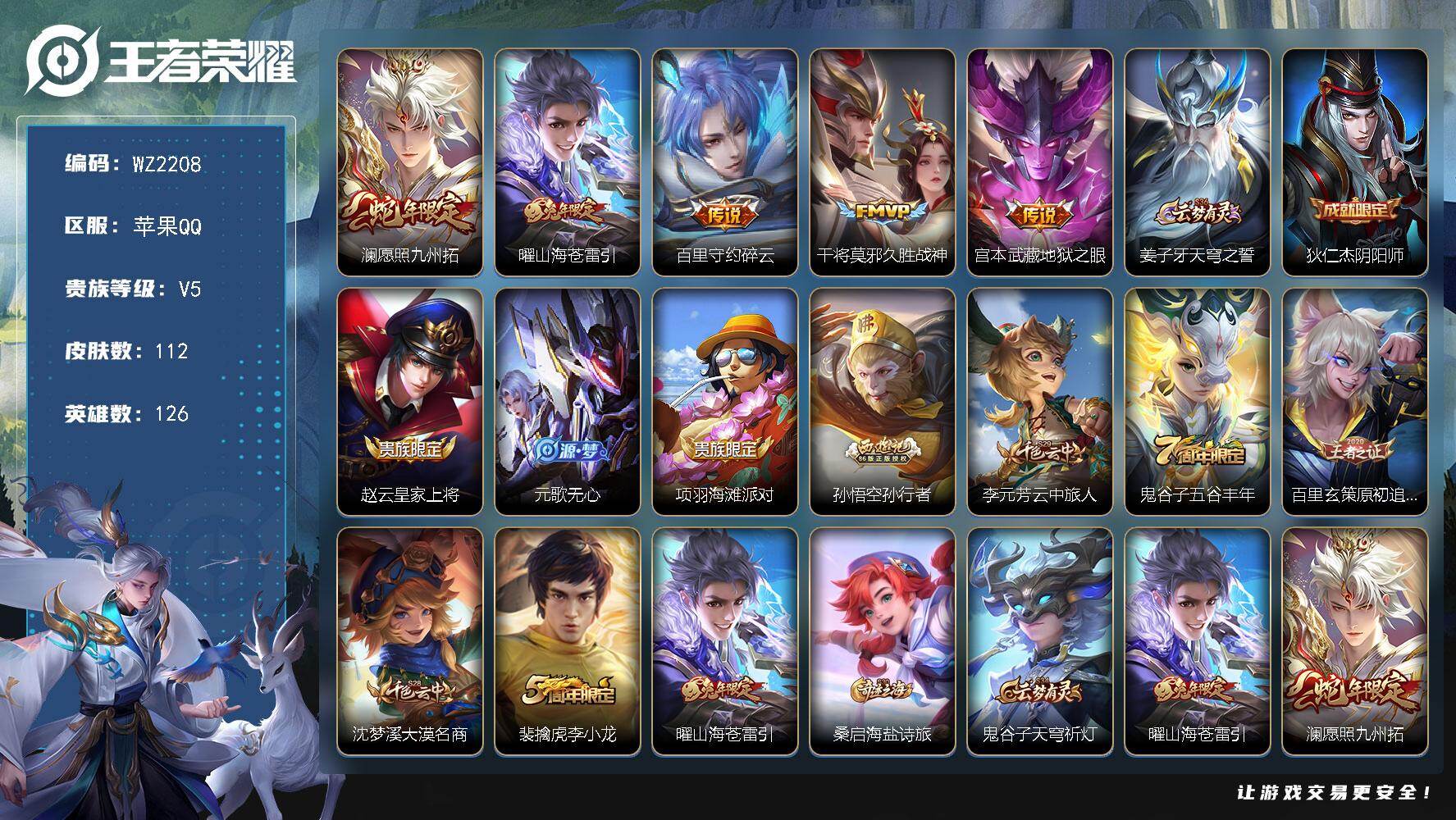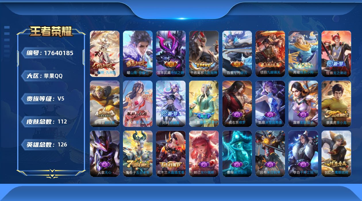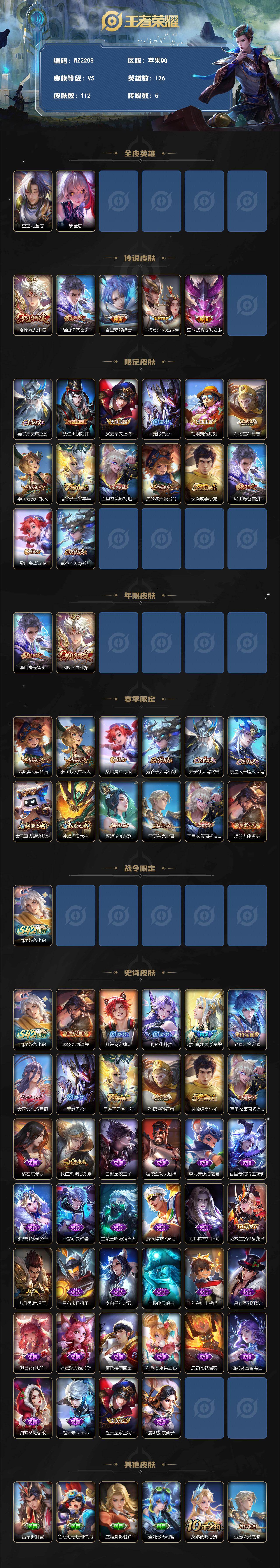 [17640185]苹果Q-112皮肤-5传说-39史诗 【英雄全皮】:空空儿全皮,影全皮 【传说皮肤】:澜愿照九州拓,曜山海苍雷引,百里守约碎云,干将莫邪久胜战神,宫本武藏地狱之眼 【限定皮肤】:姜子牙天穹之誓,狄仁杰阴阳师,赵云皇家上将,元歌无心,项羽海滩派对,孙悟空孙行者,李元芳云中旅人,鬼谷子五谷丰年,百里玄策原初追逐者,沈梦溪大漠名商,裴擒虎李小龙,曜山海苍雷引,桑启海盐诗旅,鬼谷子天穹祈灯 【年限皮肤】:曜山海苍雷引,澜愿照九州拓 【赛季限定】:沈梦溪大漠名商,李元芳云中旅人,桑启海盐诗旅,鬼谷子天穹祈灯,姜子牙天穹之誓,东皇太一噬灭天穹,太乙真人谧流熔炉,钟馗虚灵犬护,甄姬逆浪荇歌,亚瑟荣光之誓,百里玄策原初追逐者,项羽九幽镇关 【战令限定】:周瑜线条小狗 【史诗皮肤】:周瑜线条小狗,项羽九幽镇关,狂铁龙之律动,阿轲化蝶舞,赵怀真器灵浮梦炉,弈星万物之道,大司命东方月初,元歌无心,鬼谷子五谷丰年,孙悟空孙行者,裴擒虎李小龙,百里玄策原初追逐者,橘右京修罗,狄仁杰鹰眼统帅,白起星夜王子,程咬金功夫厨神,李元芳逐浪之夏,百里守约特工魅影,雅典娜冰冠公主,亚瑟心灵战警,兰陵王暗隐猎兽者,夏侯惇乘风破浪,刘邦德古拉伯爵,花木兰水晶猎龙者,张飞乱世虎臣,吕布末日机甲,李白千年之狐,曹操幽灵船长,刘禅绅士熊喵,吕布圣诞狂欢,妲己女仆咖啡,妲己魅力维加斯,嬴政摇滚巨星,孙尚香水果甜心,廉颇地狱岩魂,甄姬冰雪圆舞曲,貂蝉圣诞恋歌,赵云未来纪元,赵云皇家上将,露娜紫霞仙子 【其他皮肤】:吕布舞狮寰,鲁班七号班班快跑,虞姬溯影追猎,蚩奼极光幻客,艾琳鹤鸣心笺,亚瑟荣光之誓,哪吒罗小黑战记,莱西奥踏浪烽翎,空空儿戏梦巡演,庄周锦麟游梦,甄姬逆浪荇歌,白起死霸装,钟馗虚灵犬护,戈娅玫蓝誓约,明世隐景韶洛都,西施雪境奇遇,影魅影绮裳,典韦铁骨偃魂,太乙真人谧流熔炉,苍苍林狼骑,干将莫邪雾都夜雨,东皇太一噬灭天穹,盘古敬我三分,姜子牙天穹之誓,海诺时空谍影,鬼谷子天穹祈灯,后羿完美运算,莱西奥西部游侠,太乙真人劲辣红锅,桑启海盐诗旅,李元芳云中旅人,蒙恬蔚蓝守将,沈梦溪大漠名商,哪吒次元突破,沈梦溪鲨炮海盗猫,苏烈坚韧之力,老夫子功夫老勺,王昭君幻想奇妙夜,钟无艳海滩丽影,关羽龙腾万里,狄仁杰阴阳师,刘备万事如意,甄姬花好人间,花木兰兔女郎,达摩拳王,亚瑟死亡骑士,典韦黄金武士,孙膑天使之翼,安琪