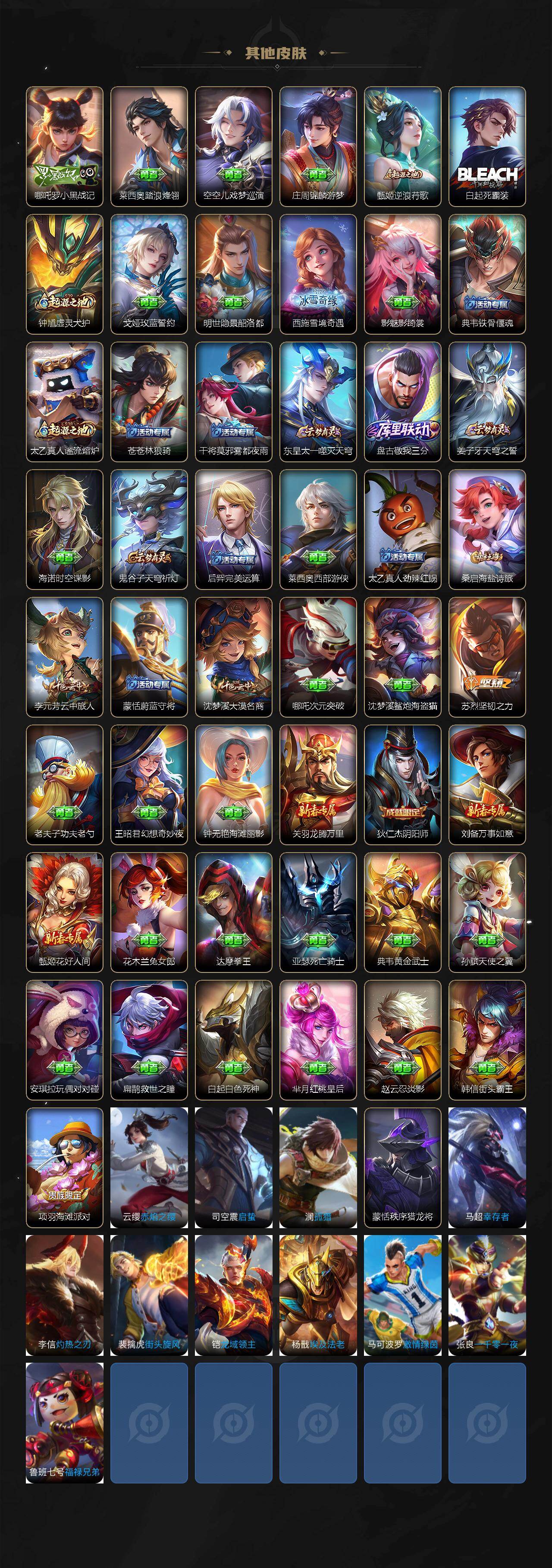 【其他皮肤】:吕布舞狮寰,鲁班七号班班快跑,虞姬溯影追猎,蚩奼极光幻客,艾琳鹤鸣心笺,亚瑟荣光之誓,哪吒罗小黑战记,莱西奥踏浪烽翎,空空儿戏梦巡演,庄周锦麟游梦,甄姬逆浪荇歌,白起死霸装,钟馗虚灵犬护,戈娅玫蓝誓约,明世隐景韶洛都,西施雪境奇遇,影魅影绮裳,典韦铁骨偃魂,太乙真人谧流熔炉,苍苍林狼骑,干将莫邪雾都夜雨,东皇太一噬灭天穹,盘古敬我三分,姜子牙天穹之誓,海诺时空谍影,鬼谷子天穹祈灯,后羿完美运算,莱西奥西部游侠,太乙真人劲辣红锅,桑启海盐诗旅,李元芳云中旅人,蒙恬蔚蓝守将,沈梦溪大漠名商,哪吒次元突破,沈梦溪鲨炮海盗猫,苏烈坚韧之力,老夫子功夫老勺,王昭君幻想奇妙夜,钟无艳海滩丽影,关羽龙腾万里,狄仁杰阴阳师,刘备万事如意,甄姬花好人间,花木兰兔女郎,达摩拳王,亚瑟死亡骑士,典韦黄金武士,孙膑天使之翼,安琪