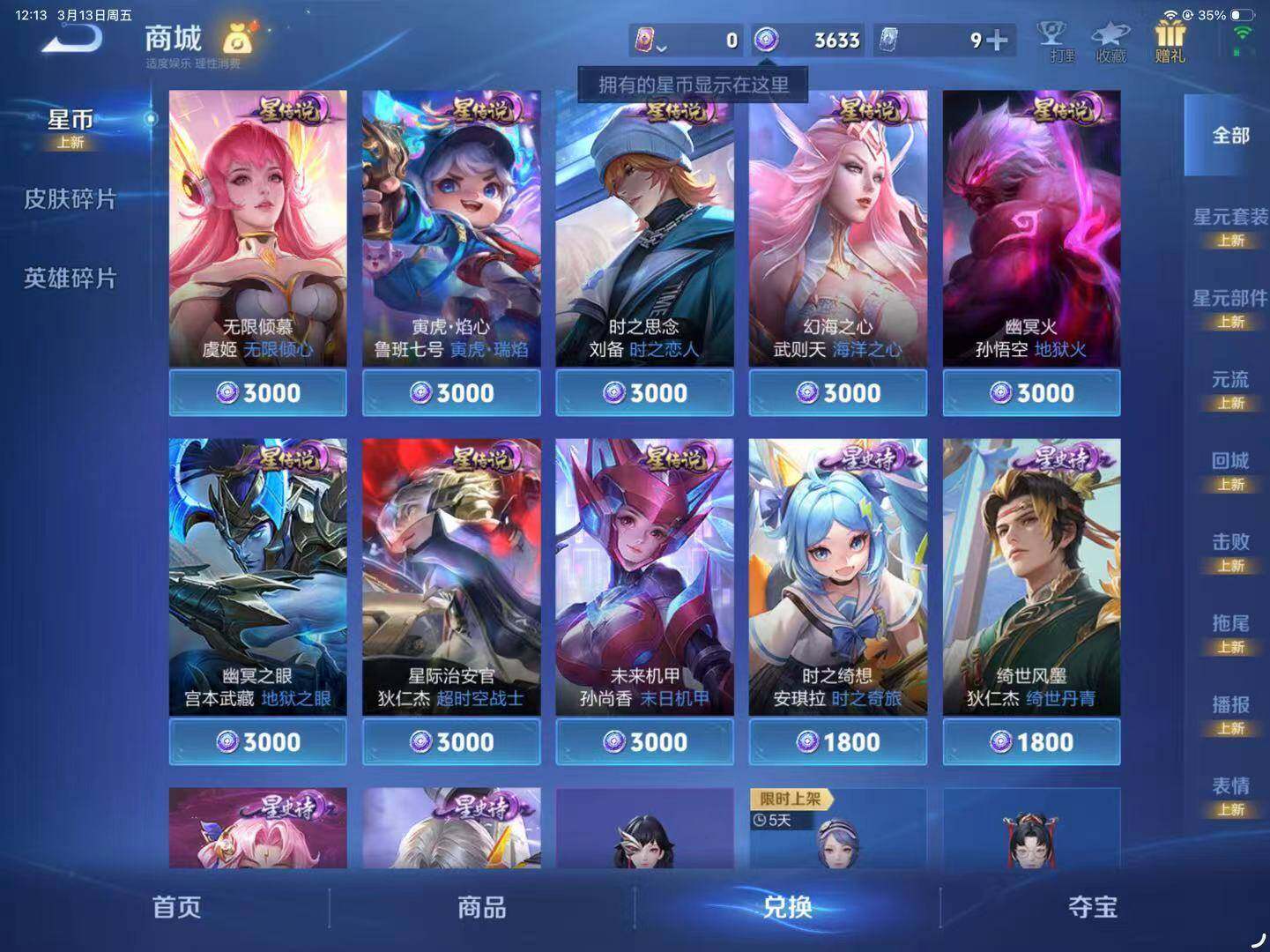 【战令限定】:沈梦溪星空之诺,马可波罗暗影游猎,芈月幻夜卜梦,狂铁电玩高手,王昭君午后时光,钟无艳超时空战士,甄姬落雪兰心,暃星界游侠,嫦娥暖冬兔眠,扁鹊奇幻香踪,杨戬潮玩骑兵,戈娅驭风魔法,西施玲珑珍味,高渐离燃音魔法,妲己灵卜魔法,蔡文姬夏日便利店,虞姬夏日便利店,