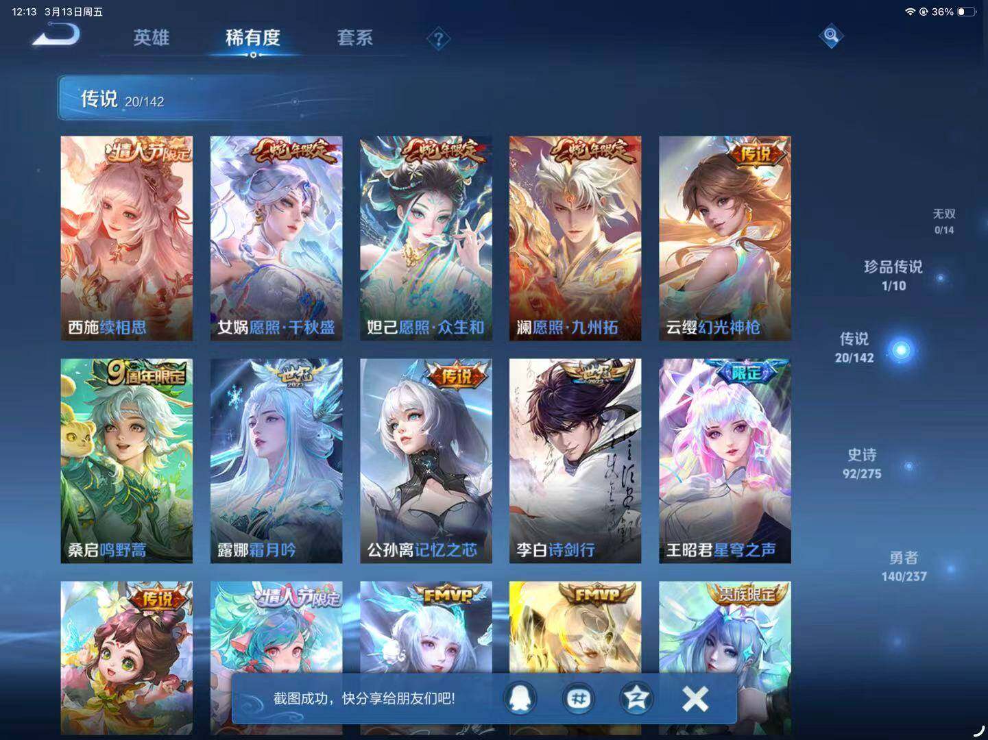 【传说皮肤】:西施续相思,女娲愿照千秋盛,妲己愿照众生和,澜愿照九州拓,云缨幻光神枪,桑启鸣野蒿,露娜霜月吟,公孙离记忆之芯,李白诗剑行,王昭君星穹之声,蔡文姬花朝如约,瑶时之祈愿,西施游龙清影,镜炽阳神光,虞姬启明星使,曜云鹰飞将,貂蝉猫影幻舞,干将莫邪久胜战神,貂蝉仲夏夜之梦,狄仁杰超时空战士