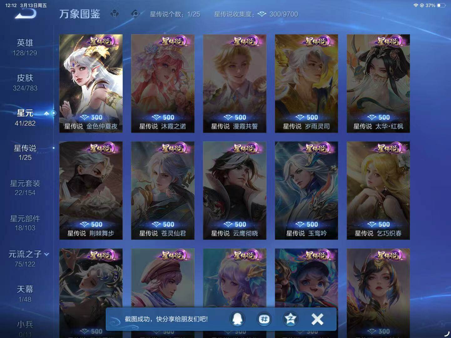 - [11364053]【商品标题】:苹果Q-V9-至尊星耀I段位-125英雄-315皮肤-1典藏-1珍品无双-0无双-4珍品传说-37传说-103史诗 【荣耀典藏】:芈月大秦宣太后 【珍品无双】:貂蝉馥梦繁花 【珍品传说】:马可波罗怪盗基德,鲁班七号江户川柯南,孙策时之奇旅,张飞兔狲蓬尾 【传说皮肤】:公孙离云诺千山,嬴政玄雷天君,桑启鸣野蒿,亚连落雪白狼,马可波罗妄想实况,诸葛亮鹤羽星尊,澜电玩雷克斯,亚瑟追逃游戏,夏洛特浮生妄,虞姬无限倾心,孙悟空齐天大圣,小乔山海琳琅生,曜山海苍雷引,李信山海炽霜斩,吕布怒海麟威,李白诗剑行,狄仁杰神器狴犴令,不知火舞绯月行,百里守约碎云,裴擒虎寅虎赤拳,赵云淬星耀世,王昭君乞巧织情,周瑜音你心动,诸葛亮时雨天司,铠绛天战甲,镜炽阳神光,虞姬启明星使,曜云鹰飞将,李信一念神魔,刘备时之恋人,貂蝉猫影幻舞,虞姬云霓雀翎,梦奇胖达荣荣,后羿黄金射手座,貂蝉仲夏夜之梦,宫本武藏地狱之眼,孙悟空地狱火 【限定皮肤】:姜子牙天穹之誓,李白谪仙醉月,狄仁杰阴阳师,小乔山海琳琅生,赵云皇家上将,墨子降魔,庄周玄嵩,钟无艳超时空战士,扁鹊奇幻香踪,元歌云间偶戏,元歌无心,甄姬幽恒,甄姬落雪兰心,马可波罗山海玄木吟,马可波罗妄想实况,狄仁杰魔术师,狄仁杰神器狴犴令,达摩沙漠行僧,项羽海滩派对,关羽冰锋战神,韩信飞衡,兰陵王金庭之子,花木兰默契交锋,不知火舞绯月行,亚瑟追逃游戏,孙悟空至尊宝,孙悟空大圣娶亲,孙悟空齐天大圣,李元芳云中旅人,虞姬启明星使,虞姬无限倾心,杨戬潮玩骑兵,鬼谷子五谷丰年,诸葛亮时雨天司,诸葛亮鹤羽星尊,苏烈玄武志,百里守约朱雀志,沈梦溪大漠名商,沈梦溪匿光破解者,裴擒虎寅虎赤拳,裴擒虎擒涛扼浪,瑶山海碧波行,云中君纤云弄巧,李信山海炽霜斩,伽罗天狼溯光者,上官婉儿神器万象笔,嫦娥暖冬兔眠,曜山海苍雷引,西施玲珑珍味,蒙犽狂想玩偶喵,鲁班大师探海日志,盘古冰霜神祇,镜匿光追影者,桑启海盐诗旅,夏洛特浮生妄,暃星界游侠,戈娅驭风魔法,艾琳女武神,艾琳流音漫舞,司空震地狱燃心,阿古朵江河有灵,张良古海寻踪,高渐离燃音魔法,妲己灵卜魔法,鬼谷子天穹祈灯,伽罗琥珀纪元,亚连落雪白狼,沈梦溪龙舞盛年,鲁班七号蔬乡物语,李元芳蔬乡物语,刘邦剑破天穹,程咬金群星魔术团,周瑜熔金海岸 【年限皮肤】:百里守约朱雀志,苏烈玄武志,裴擒虎寅虎赤拳,诸葛亮时雨天司,