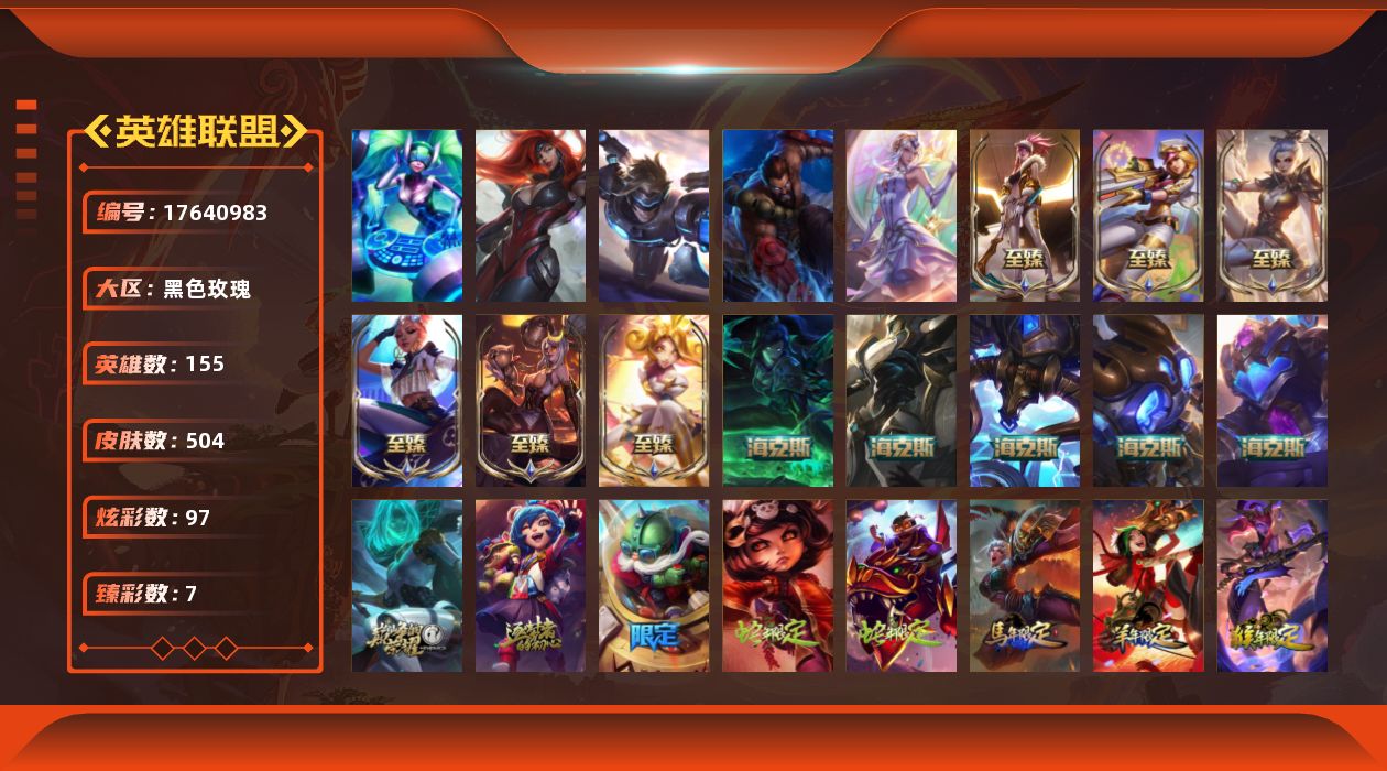[17640983]未定级段位-155英雄-504皮肤-97炫彩-5终极-13神话-75限定-44传说-142史诗