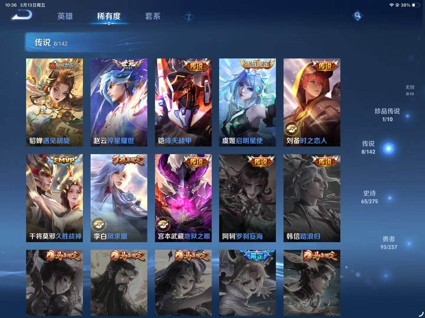 【传说皮肤】:貂蝉遇见胡旋,赵云淬星耀世,铠绛天战甲,虞姬启明星使,刘备时之恋人,干将莫邪久胜战神,李白凤求凰,宫本武藏地狱之眼