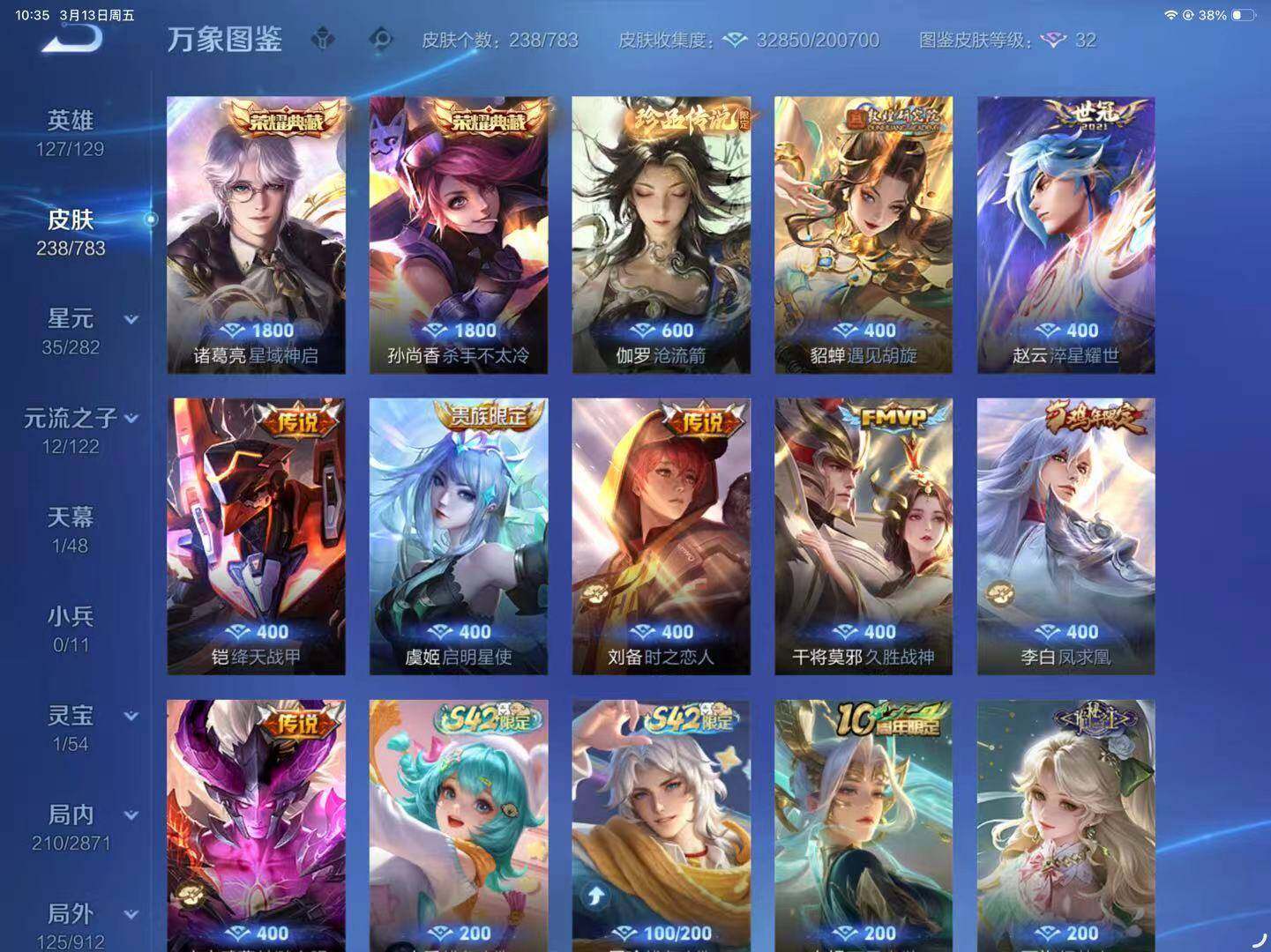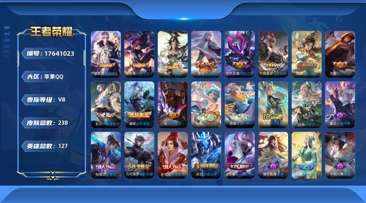 [17641023]苹果Q-V8-238皮肤-2典藏皮肤-1珍品传说-8传说-64史诗 【荣耀典藏】:孙尚香杀手不太冷,诸葛亮星域神启 【珍品传说】:伽罗沧流箭 【传说皮肤】:貂蝉遇见胡旋,赵云淬星耀世,铠绛天战甲,虞姬启明星使,刘备时之恋人,干将莫邪久胜战神,李白凤求凰,宫本武藏地狱之眼 【限定皮肤】:狄仁杰阴阳师,赵云皇家上将,墨子神迹守卫,嬴政优雅恋人,嬴政白昼王子,孙尚香蔷薇恋人,庄周高山流水,扁鹊奇幻香踪,芈月幻夜卜梦,吕布猎兽之王,元歌无心,夏侯惇朔风刀,甄姬游园惊梦,马可波罗暗影游猎,狄仁杰魔术师,狄仁杰万华元夜,达摩沙漠行僧,项羽海滩派对,老夫子醍醐杖,老夫子航海奇遇记,关羽冰锋战神,貂蝉遇见胡旋,程咬金演武夺筹,兰陵王金庭之子,孙悟空美猴王,孙悟空至尊宝,孙悟空大圣娶亲,牛魔御旌,后羿圣弓游侠,李元芳银河之约,李元芳云中旅人,虞姬启明星使,钟馗驱傩正仪,杨玉环遇见飞天,杨戬潮玩骑兵,干将莫邪真爱魔法,雅典娜黎明之约,蔡文姬繁星吟游,鬼谷子原初探秘者,鬼谷子五谷丰年,黄忠火炮绅士,苏烈千军破阵,百里玄策原初追逐者,弈星混沌棋,梦奇顽趣,沈梦溪星空之诺,沈梦溪大漠名商,明世隐疑决卦,裴擒虎李小龙,裴擒虎擒涛扼浪,狂铁御狮,米莱狄御霄,盾山御銮,猪八戒西部大镖客,上官婉儿梁祝,上官婉儿天狼绘梦者,嫦娥拒霜思,嫦娥暖冬兔眠,鲁班大师探海日志,桑启海盐诗旅 【年限皮肤】:孙悟空美猴王,李白凤求凰 【赛季限定】:狂铁御狮,米莱狄御霄,牛魔御旌,盾山御銮,夏侯惇朔风刀,弈星混沌棋,明世隐疑决卦,老夫子醍醐杖,鬼谷子原初探秘者,狄仁杰万华元夜,程咬金演武夺筹,钟馗驱傩正仪,苏烈千军破阵,达摩沙漠行僧,兰陵王金庭之子,沈梦溪大漠名商,李元芳云中旅人,桑启海盐诗旅,裴擒虎擒涛扼浪,鲁班大师探海日志,甄姬逆浪荇歌,百里玄策原初追逐者,雅典娜黎明之约,梦奇顽趣 【战令限定】:嬴政白昼王子,吕布猎兽之王,李元芳银河之约,沈梦溪星空之诺,马可波罗暗影游猎,猪八戒西部大镖客,老夫子航海奇遇记,墨子神迹守卫,干将莫邪真爱魔法,后羿圣弓游侠,黄忠火炮绅士,芈月幻夜卜梦,嫦娥暖冬兔眠,扁鹊奇幻香踪,杨戬潮玩骑兵,周瑜线条小狗,小乔线条小狗 【史诗皮肤】:周瑜线条小狗,小乔线条小狗,女娲万灵启世,西施织梦人,黄忠百相守梦,赵怀真器灵浮梦炉,刘禅电玩爆裂旋风,扁鹊奇幻香踪,梦奇顽趣,元歌无心,鬼谷子五谷丰
