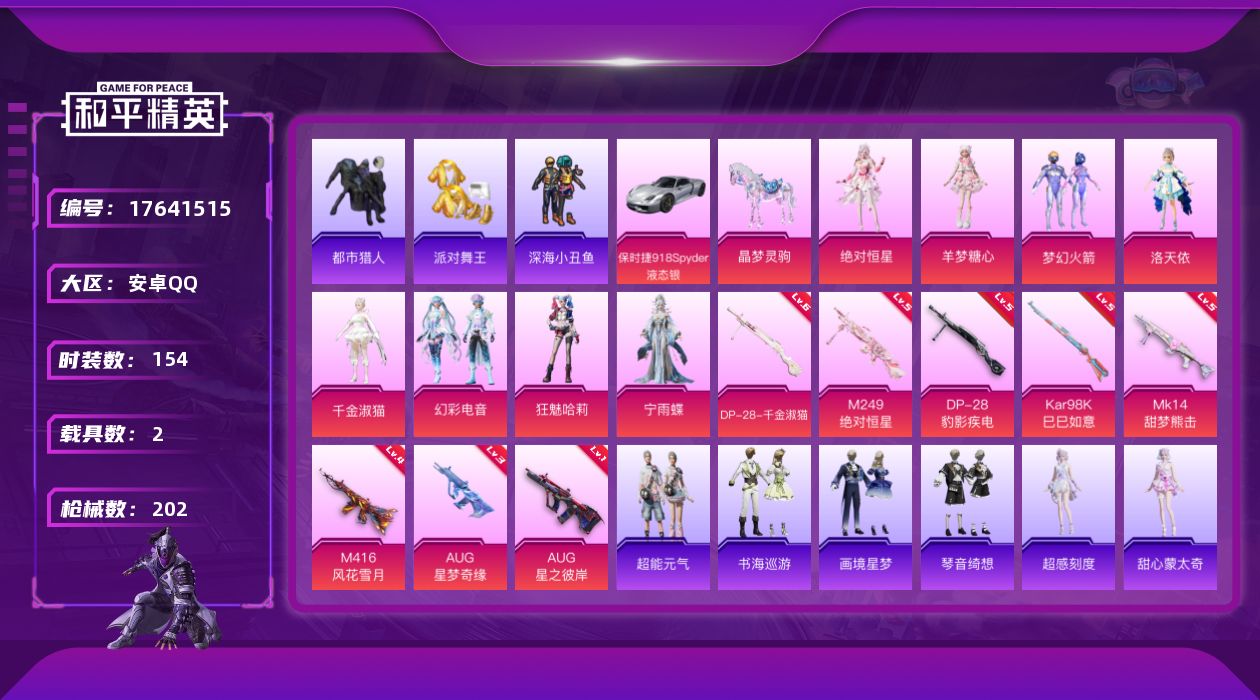 [17641515]【特价出售/店主推荐】/绝世印记1 安卓 手Q-8粉装-11特效枪-2载具-4粉色飞行器-62013热力值-9王牌印记-154套装-202枪皮【热门品类】:粉装-梦幻火箭,套装-浪漫天命,套装-都市猎人,套装-派对舞王,套装-深海小丑鱼,套装-小丑鱼,套装-暗影哥特,套装-粉红小猪,套装-糯粉咩咩【粉色套装】:角色-绝对恒星,粉装-梦幻火箭,角色-洛天依,角色-千金淑猫,粉装-幻彩电音,角色-狂魅哈莉,角色-宁雨蝶,角色-羊梦糖心【粉色枪皮等级】:M416-风花雪月(四级),AUG-星之彼岸(一级),AUG-星梦奇缘(三级),ACE32-萌骑漫游(二级),AKS-74U-森灵之息(五级),Kar98K-巳巳如意(五级),Mk14-甜梦熊击(五级),Mk14-福马献瑞(五级),M249-绝对恒星(七级),DP-28-千金淑猫(六级),DP-28-豹影疾电(五级)【粉色载具】:保时捷918 Spyder(液态银),晶梦灵驹【粉色枪皮】:M416-风花雪月,AUG-星之彼岸,AUG-星梦奇缘,ACE32-萌骑漫游,AKS-74U-森灵之息,Kar98K-巳巳如意,Mk14-甜梦熊击,Mk14-福马献瑞,M249-绝对恒星,DP-28-千金淑猫,DP-28-豹影疾电【粉色飞行器】:绝对恒星飞行器,香车宝马飞行器,炫彩糖果飞行器,梦幻火箭飞行器