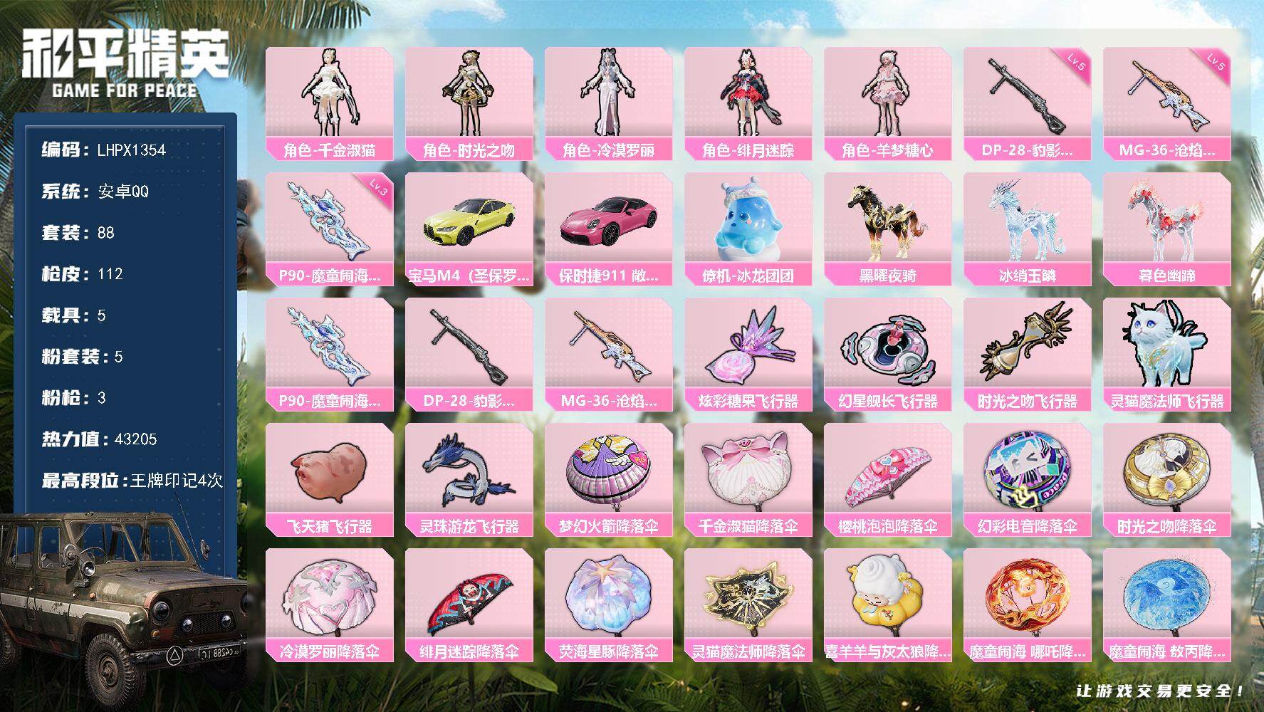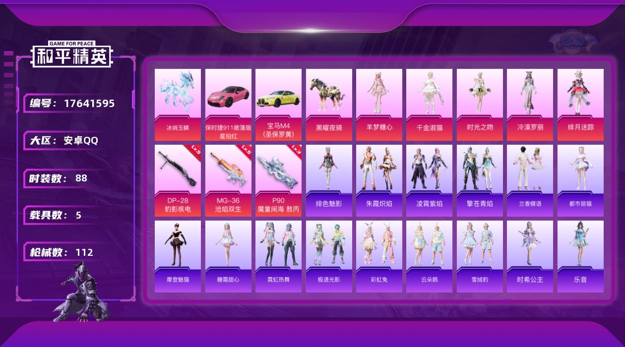 [17641595]【特价出售/店主推荐】安卓 手Q-5粉装-3特效枪-5载具-7粉色飞行器-43205热力值-4王牌印记-88套装-112枪皮 【粉色套装】:角色-千金淑猫,角色-时光之吻,角色-冷漠罗丽,角色-绯月迷踪,角色-羊梦糖心 【粉色枪皮等级】:P90-魔童闹海 敖丙(三级),DP-28-豹影疾电(五级),MG-36-沧焰双生(五级) 【粉色载具】:宝马M4(圣保罗黄),保时捷911 敞篷版(星珀红),僚机-冰龙团团,黑曜夜骑,冰绡玉鳞,暮色幽蹄 【粉色枪皮】:P90-魔童闹海 敖丙,DP-28-豹影疾电,MG-36-沧焰双生 【粉色飞行器】:炫彩糖果飞行器,幻星舰长飞行器,时光之吻飞行器,灵猫魔法师飞行器,飞天猪飞行器,灵珠游龙飞行器 【粉色降落伞】:梦幻火箭降落伞,千金淑猫降落伞,樱桃泡泡降落伞,幻彩电音降落伞,时光之吻降落伞,冷漠罗丽降落伞,绯月迷踪降落伞,荧海星豚降落伞,灵猫魔法师降落伞,喜羊羊与灰太狼降落伞,魔童闹海 哪吒降落伞,魔童闹海 敖丙降落伞,炫彩糖果降落伞 【稀有套装】:套装-兰香蝶语,套装-炫彩糖果,角色-都市丽猫,角色-摩登魅猫,角色-糖霜甜心,套装-霓虹热舞,套装-极速光影,套装-彩虹兔,套装-云朵鹅,套装-雪绒豹,角色-时希公主,角色-乐音,角色-玫纹锢梦,角色-黯羽织刑,套装-蜜露汐语,角色-绛羽幽主,套装-朱霞炽焰,套装-凌霄紫焰,套装-擎苍青焰,角色-绯色魅影,角色-暖阳柴柴 【稀有枪皮】:AKM-灼热熔岩,AKM-霓虹街区,AKM-灵猫魔法师,M16A4-千金淑猫,SCAR-L-生命誓言,SCAR-L-红色方程式,SCAR-L-绯月迷踪,M416-红色方程式,M416-蓝色火焰,GROZA-荧海星豚,AUG-耀粉歌者,M762-天降萌叽,M762-牛气冲天,M762-云朵鹅,Mk47-洛神天依,G36C-灵驹仙姬,AC-VAL-时光之吻,蜜獾-绯穹魔姬,ARX-凌霄紫焰,UZI-啾咪啾咪,UZI-天降萌叽,UMP45-蓝色火焰,汤姆逊-灵猫魔法师,汤姆逊-樱桃泡泡,野牛-最终圣卫者,JS9-凌霄紫焰,Kar98K-红色方程式,M24-幻彩电音,M24-时光之吻,M24-樱桃泡泡,Mini14-绯穹魔姬,Mk14-魔药课室,AMR-时光之誓,M417-虹云熊熊,MK20-H-樱桃泡泡,SVD-云朵鹅,SVD-冷漠罗丽,S686-生命誓言,