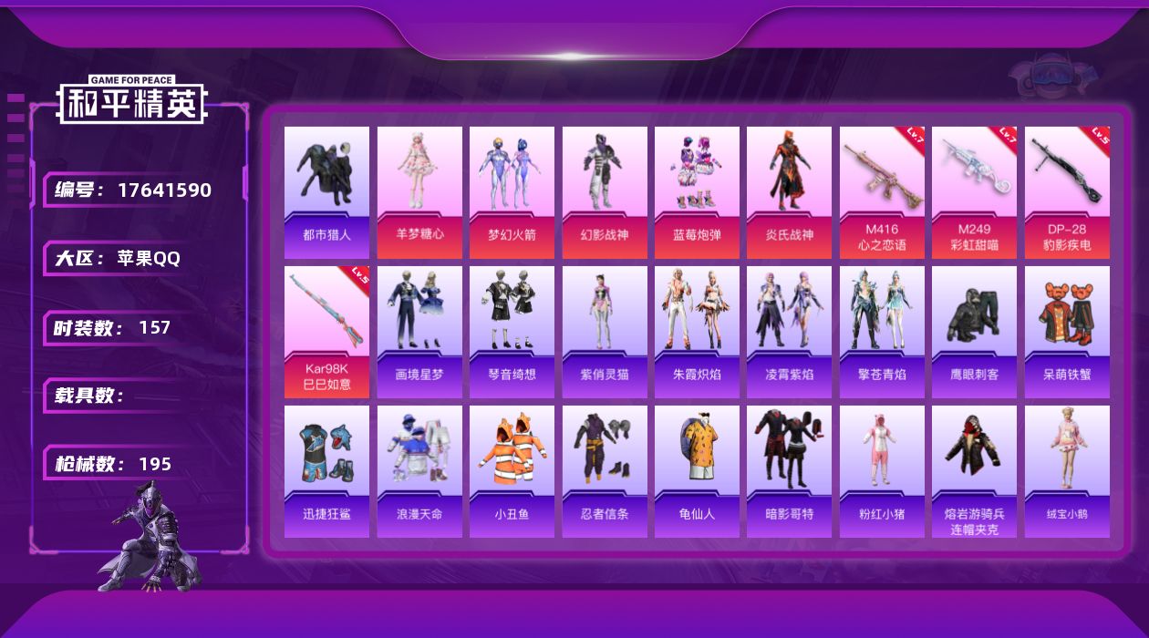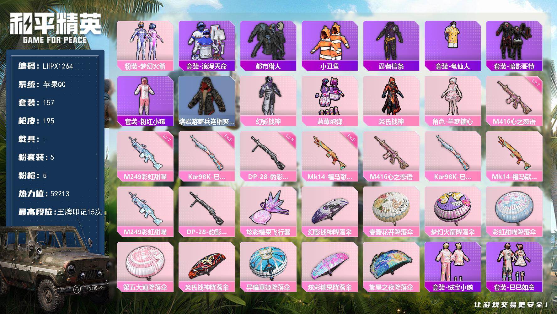 [17641590]【特价出售/店主推荐】苹果 手Q-5粉装-5特效枪-0载具-1粉色飞行器-59213热力值-15王牌印记-157套装-195枪皮