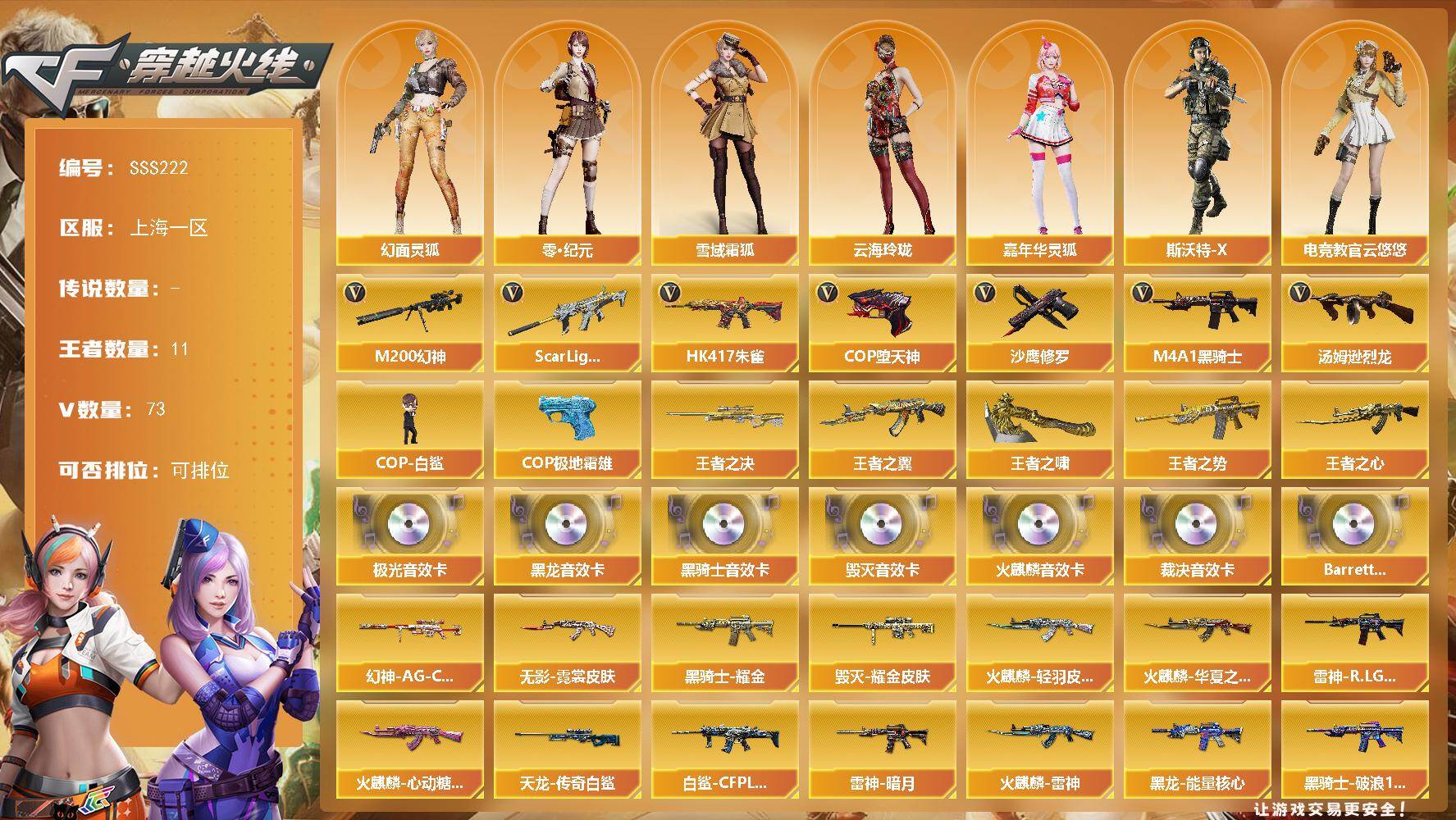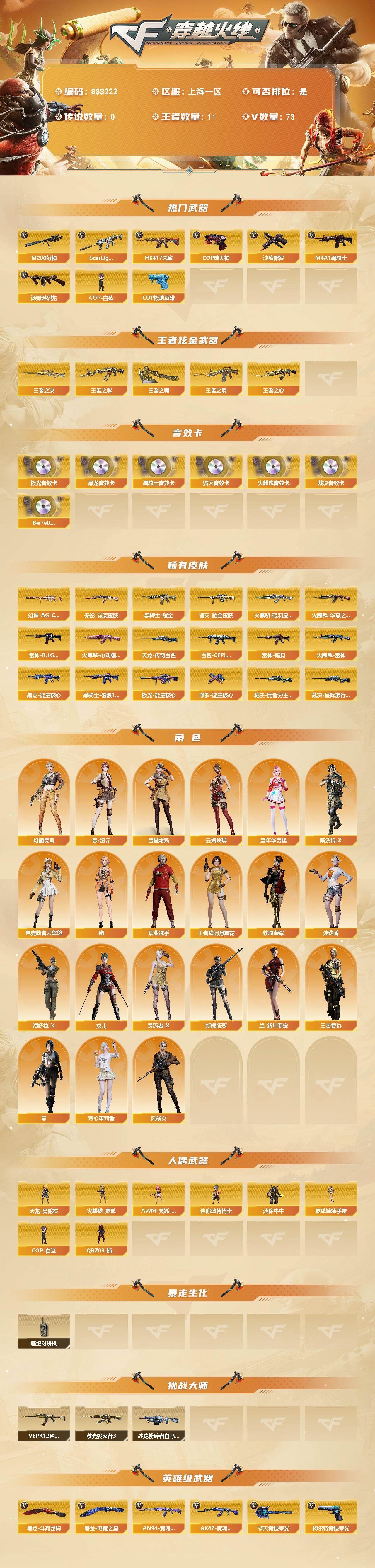 [17641992]上海一区-78V-11王者武器数-0炫金武器数 【热门武器】:Scar Light-白虎,HK417-朱雀,M200-幻神,M4A1-黑骑士,汤姆逊-烈龙*2,COP-白鲨,COP-堕天神,沙鹰-修罗*5,COP 357-极地霜雄 【王者炫金武器】:王者之翼,王者之势*2,王者之心,王者之决,王者之啸 【音效卡】:AK47-火麒麟音效卡,M4A1-黑龙音效卡,M4A1-黑骑士音效卡,Barrett-毁灭音效卡,Barrett-极光音效卡,AWM-裁决音效卡,Barrett-碧霄极光音效卡 【皮肤】:幻神-AG-CFPL S24冠军 皮肤,白虎-白鲨-CFPLS23冠军,裁决-胜者为王 皮肤,裁决-星际旅行 皮肤,雷神-暗月,雷神-R.LGD-CFPLS18冠军,火麒麟-雷神,火麒麟-华夏之心,火麒麟-轻羽皮肤,火麒麟-心动糖果,毁灭耀金皮肤*2,黑龙-能量核心,黑骑士耀金皮肤,黑骑士-破浪10年皮肤,无影-霓裳皮肤,AWM-天龙-传奇白鲨,极光-能量核心,修罗-能量核心 【角色】:零,迷迭香,电竞教官-云悠悠,零·纪元,王者-瞳-闭月羞花,王者复仇,雪域霜狐,云海玲珑,幻面灵狐,芳心审判者,风暴女,嘉年华灵狐,兰-新年限定,灵狐者-X,龙儿,潘多拉-X,斯沃特-X,铁骑荣耀,新娜塔莎,幽,职业选手 【人偶武器】:COP-白鲨,天龙-曼陀罗,火麒麟-灵狐,AWM-灵狐-15周年嘉年华,迷你波特博士,迷你牛牛,QBZ03-斯沃特,灵狐娃娃手雷 【暴走生化】:超级对讲机 【挑战大师】:冰龙粉碎者-白马银枪,VEPR-12-金魔*2,激光毁灭者III 【英雄级武器】:AK47-火麒麟*2,M4A1-黑龙,M4A1-雷神*2,M4A1-黑骑士,AK47-无影,AK47-黑武士,M4A1-龙血,HK417-朱雀,Scar Light-白虎,M4A1-夜魔,无影-神兵利器,9A91-烈火,王者之武-觉醒版,王者之魄-觉醒版,王者冰魄-觉醒版,黑骑士-海王,黑武士-CF网剧冠军,机械迷城-穹宇,AWM-天龙*2,Barrett-毁灭,Barrett-极光,AWM-裁决*2,M200-幻神,王者之怒-觉醒版,王者之力-觉醒版,汤姆逊-烈龙*2,沙鹰-修罗*5,沙鹰-天神,COP-堕天神,柯尔特-竞技荣光,破空枪刃-夜魔,天神-CF网剧冠军,屠龙*4,马来剑-夜魔,麒麟刺,擎天-竞技