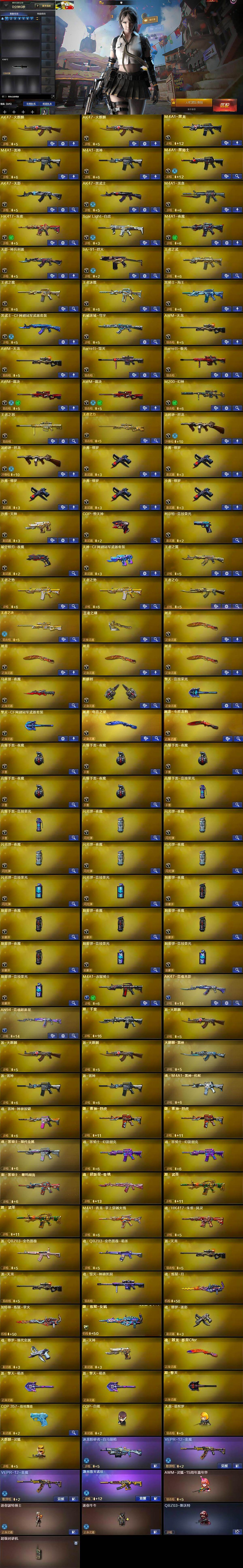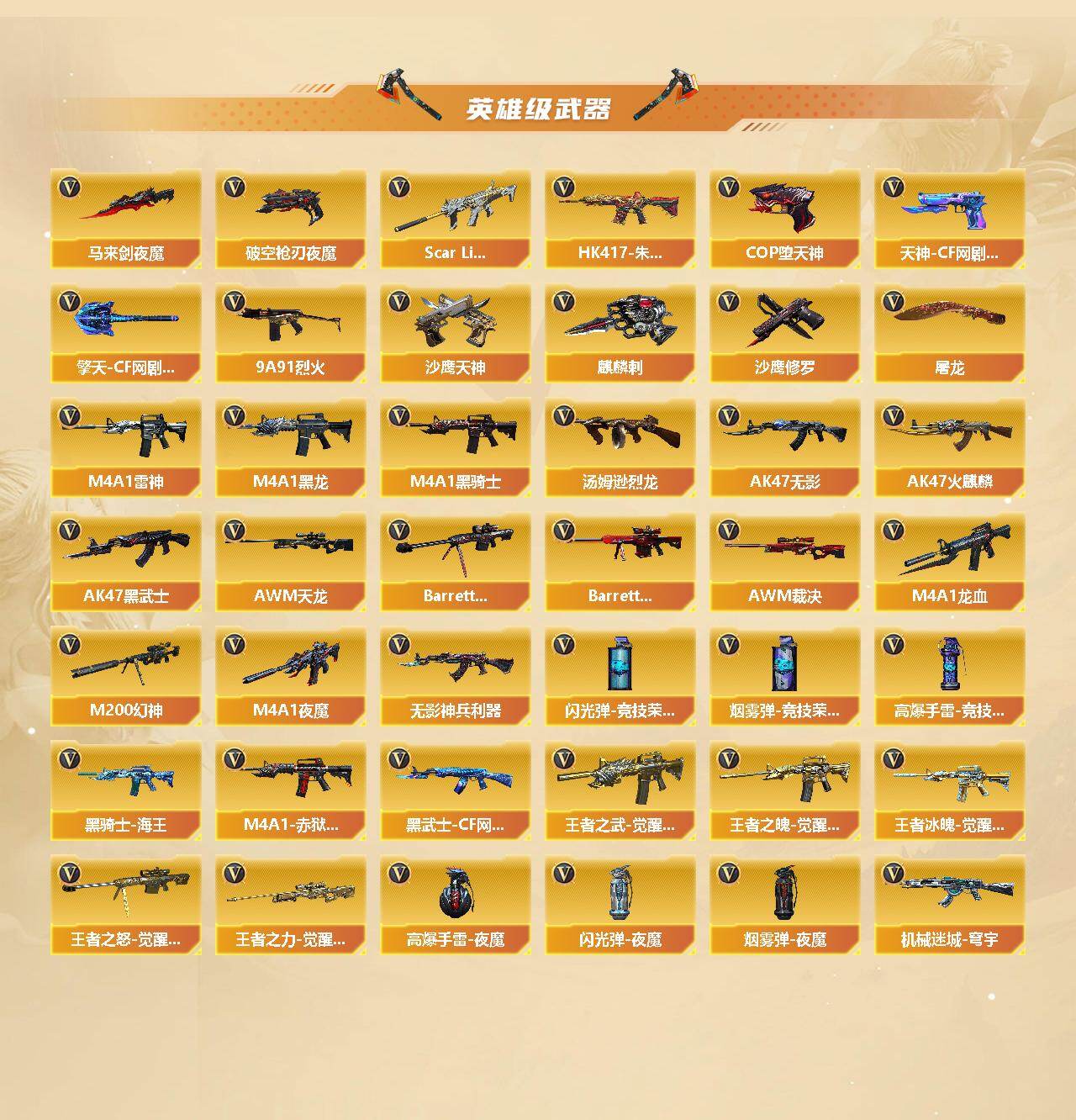 【英雄级武器】:AK47-火麒麟*2,M4A1-黑龙,M4A1-雷神*2,M4A1-黑骑士,AK47-无影,AK47-黑武士,M4A1-龙血,HK417-朱雀,Scar Light-白虎,M4A1-夜魔,无影-神兵利器,9A91-烈火,王者之武-觉醒版,王者之魄-觉醒版,王者冰魄-觉醒版,黑骑士-海王,黑武士-CF网剧冠军,机械迷城-穹宇,AWM-天龙*2,Barrett-毁灭,Barrett-极光,AWM-裁决*2,M200-幻神,王者之怒-觉醒版,王者之力-觉醒版,汤姆逊-烈龙*2,沙鹰-修罗*5,沙鹰-天神,COP-堕天神,柯尔特-竞技荣光,破空枪刃-夜魔,天神-CF网剧冠军,屠龙*4,马来剑-夜魔,麒麟刺,擎天-竞技
