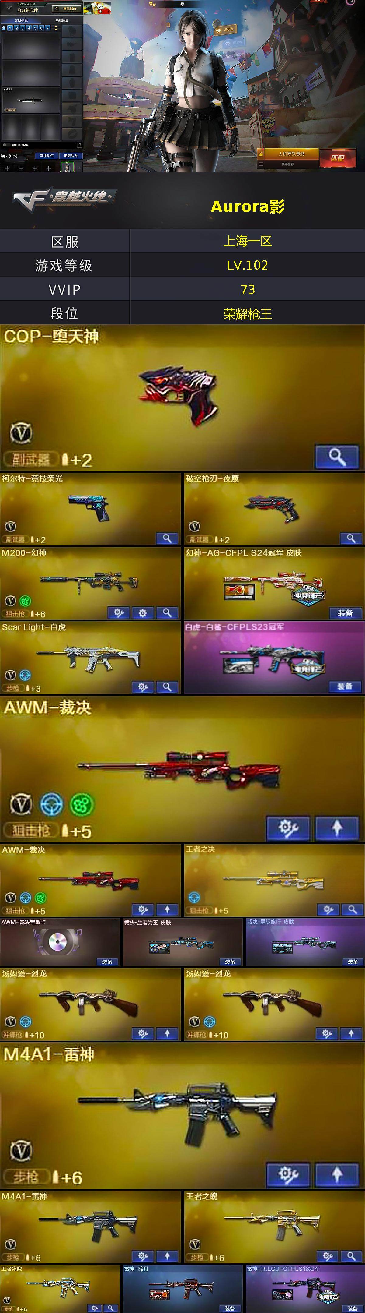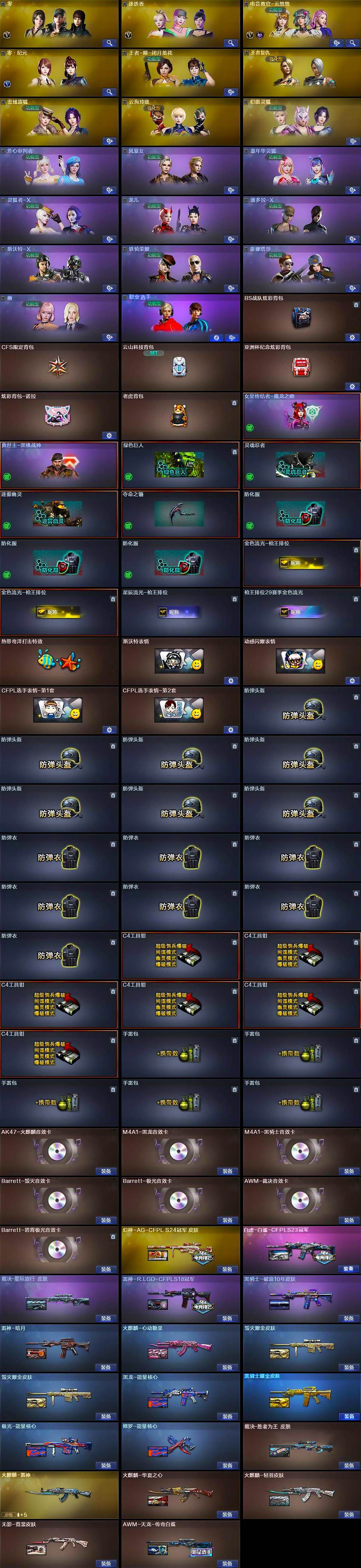 【皮肤】:幻神-AG-CFPL S24冠军 皮肤,白虎-白鲨-CFPLS23冠军,裁决-胜者为王 皮肤,裁决-星际旅行 皮肤,雷神-暗月,雷神-R.LGD-CFPLS18冠军,火麒麟-雷神,火麒麟-华夏之心,火麒麟-轻羽皮肤,火麒麟-心动糖果,毁灭耀金皮肤*2,黑龙-能量核心,黑骑士耀金皮肤,黑骑士-破浪10年皮肤,无影-霓裳皮肤,AWM-天龙-传奇白鲨,极光-能量核心,修罗-能量核心