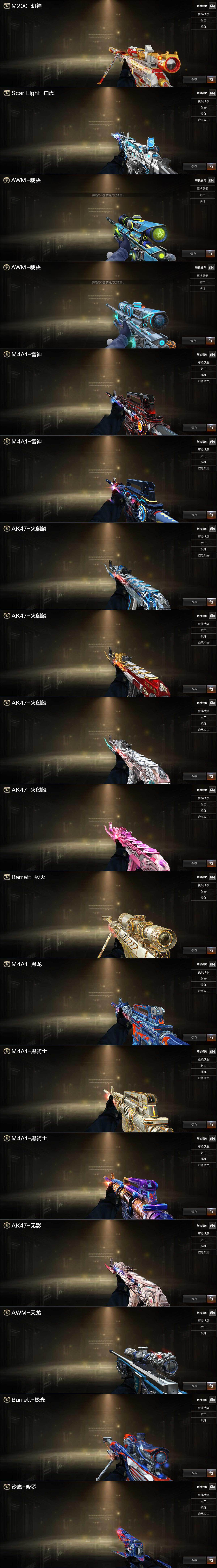 【热门武器】:Scar Light-白虎,HK417-朱雀,M200-幻神,M4A1-黑骑士,汤姆逊-烈龙*2,COP-白鲨,COP-堕天神,沙鹰-修罗*5,COP 357-极地霜雄