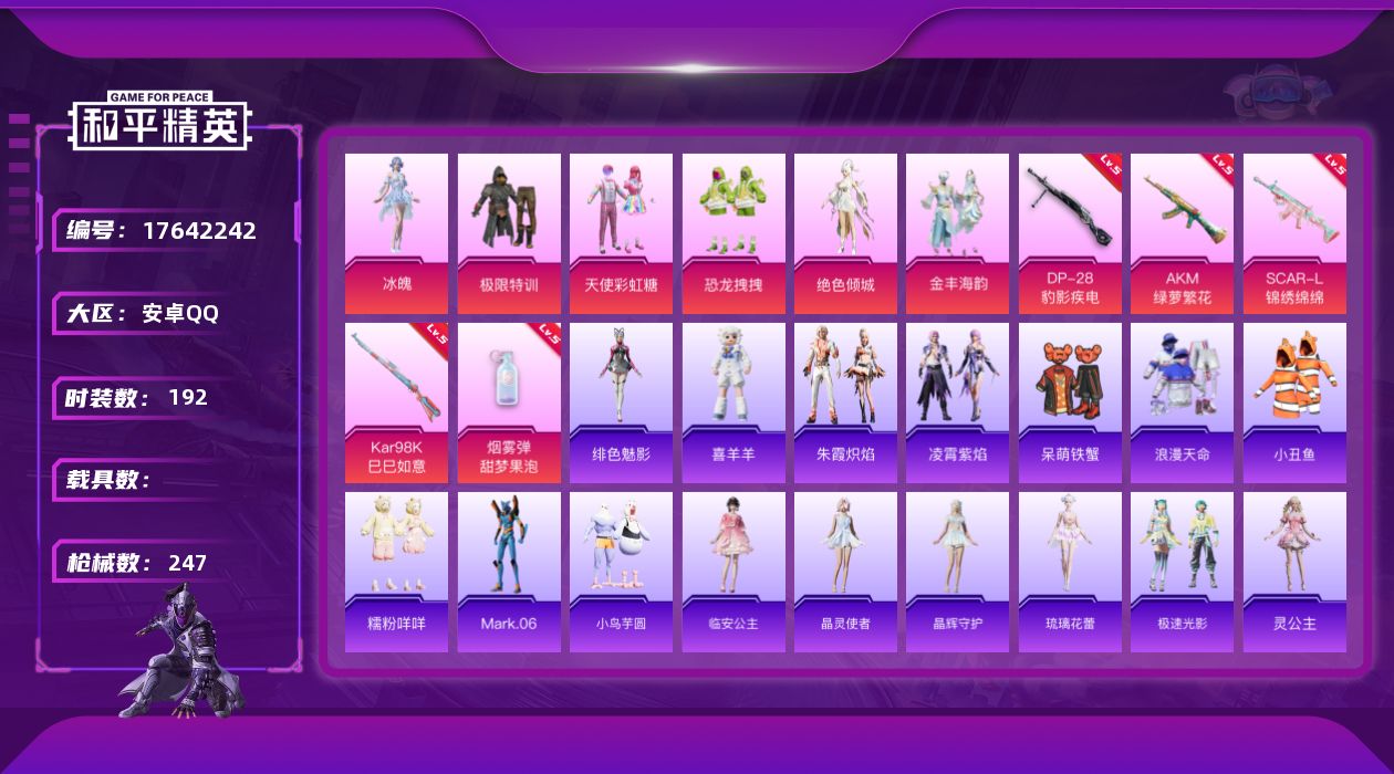 [17642242]安卓 手Q-6粉装-5特效枪-0载具-6粉色飞行器-74782热力值-16王牌印记-192套装-247枪皮